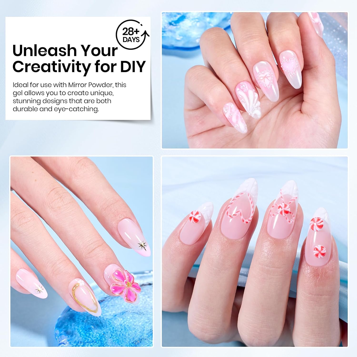 - Multi-Purpose 3D Nail Art Gel: This 3D nail art gel allows beginners to create their desired 3D nail art confidently. Easy to mix with different colors and apply with magic mirror powder, sequins, and nail polish, but can also be used for carving, sticking decorations, shaping, and more. This solid nail glue is friendly for nail beginners and nail lovers.