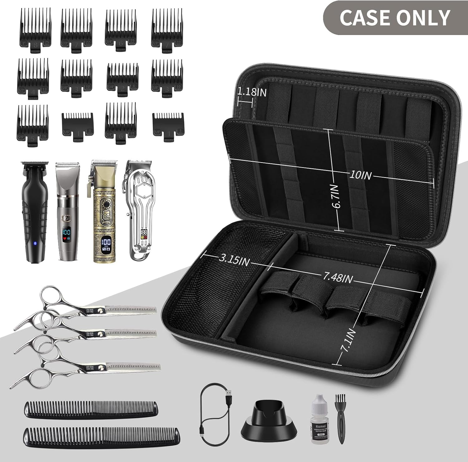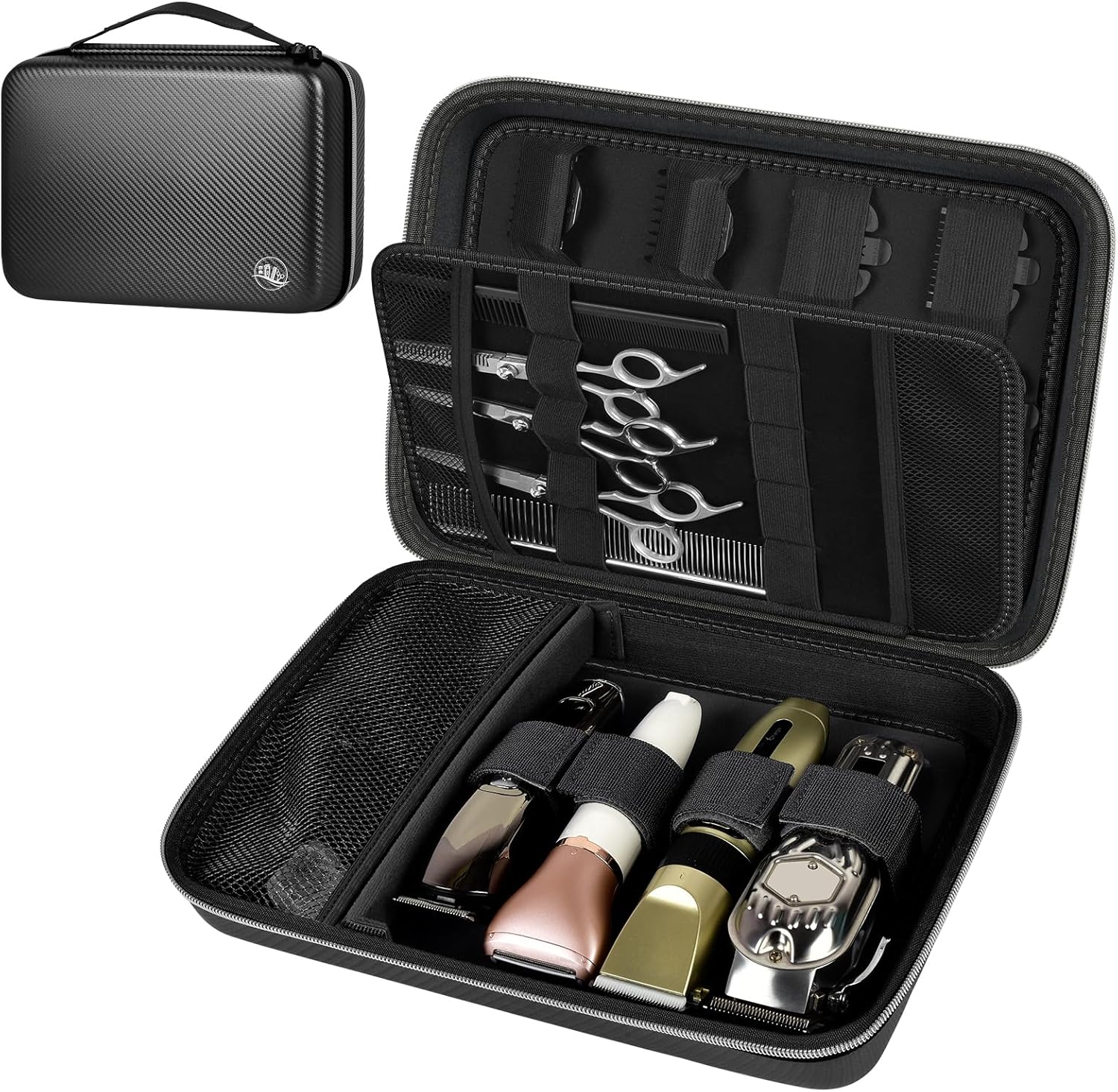 - Large Capacity Barber Bag: Barber clippers storage bag with top cover is ingeniously designed to accommodate 12 limit combs of varying sizes, catering to diverse hair-cutting requirements. Ample base is capable of holding four clippers, bottom with a mesh pocket and partition system that efficiently separates tools and accessories. Adjustable Velcro straps allow for secure placement of shavers of different sizes, ensuring a snug fit for every tool.