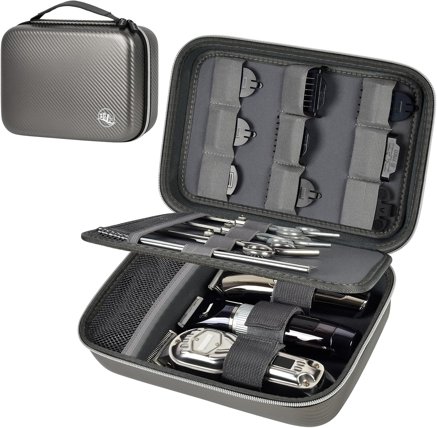 - Large Capacity Hair Shears Storage: Barber clippers storage bag with top cover is ingeniously designed to accommodate 9 limit combs of varying sizes, catering to diverse hair-cutting requirements. Ample base is capable of holding four clippers, bottom with a mesh pocket and partition system that efficiently separates tools and accessories, maintaining an organized interior. Adjustable Velcro straps allow for secure placement of shavers of different sizes, ensuring a snug fit for every tool.