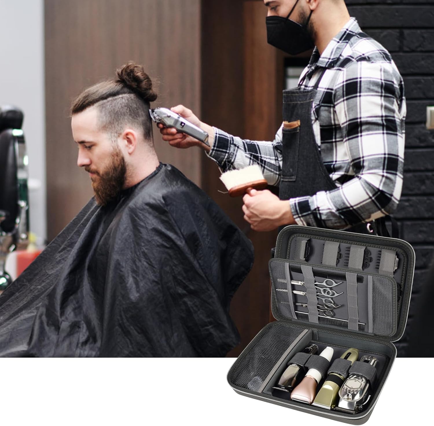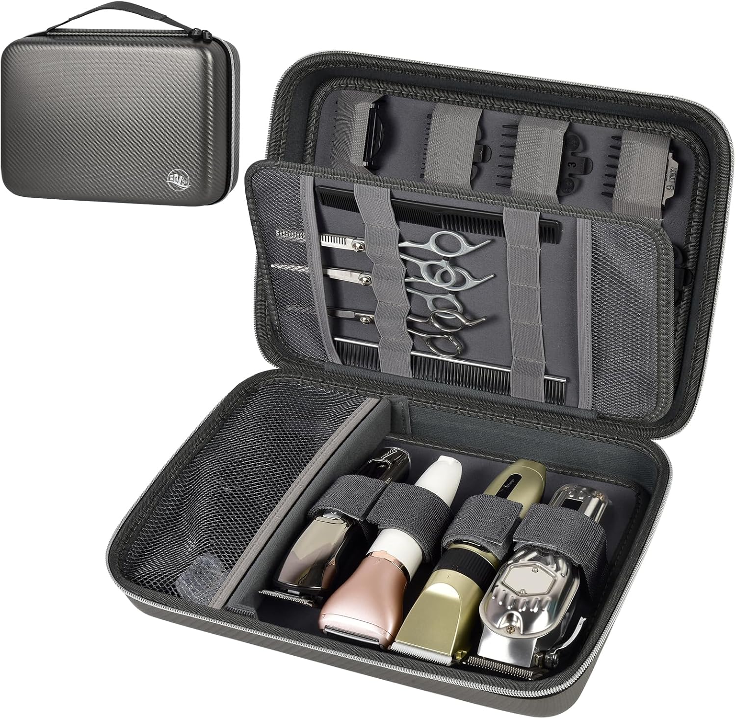 - Large Capacity Barber Bag: Barber clippers storage bag with top cover is ingeniously designed to accommodate 12 limit combs of varying sizes, catering to diverse hair-cutting requirements. Ample base is capable of holding four clippers, bottom with a mesh pocket and partition system that efficiently separates tools and accessories. Adjustable Velcro straps allow for secure placement of shavers of different sizes, ensuring a snug fit for every tool.