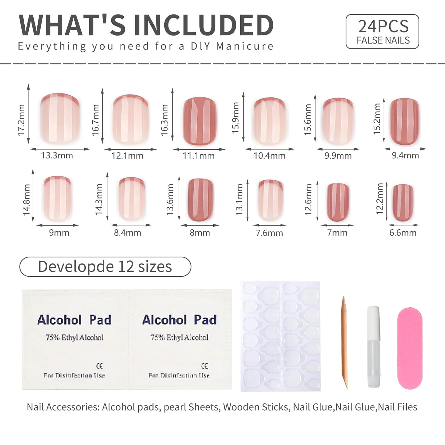 - Package Includes: 24 pcs stick on false glue on nails kit, each box includes 24 short press on nails, 1 sheet of 24 sticky nail pieces, 1 cuticle stick, 1 double sided nail file and gel press on nails cleaning pads, a small tube of nail glue,All the tools you need to apply the nails are included in one set