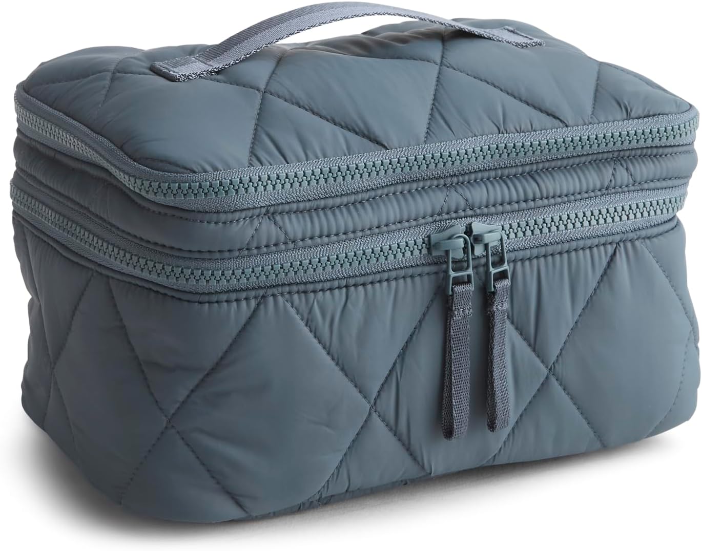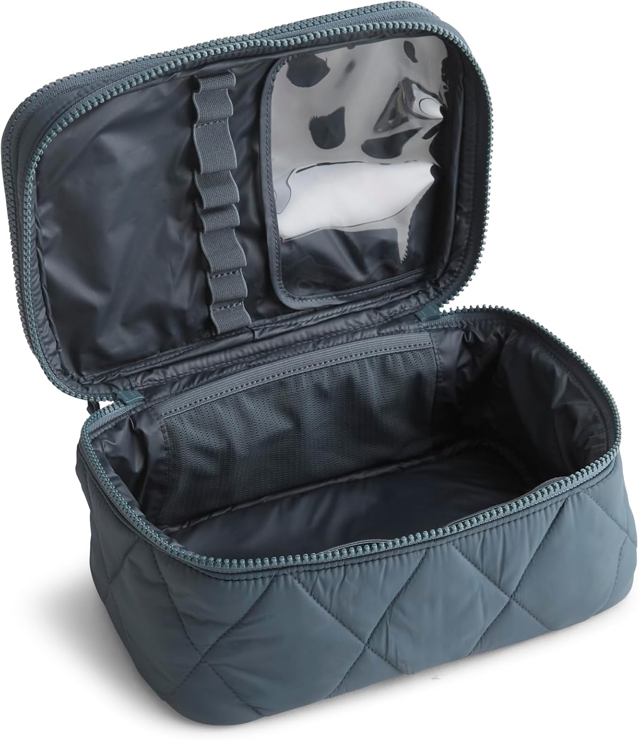- DETAILS - Interior features two zip pockets, two slip pockets, and eight elastic makeup brush loops with a wipeable TPU cover