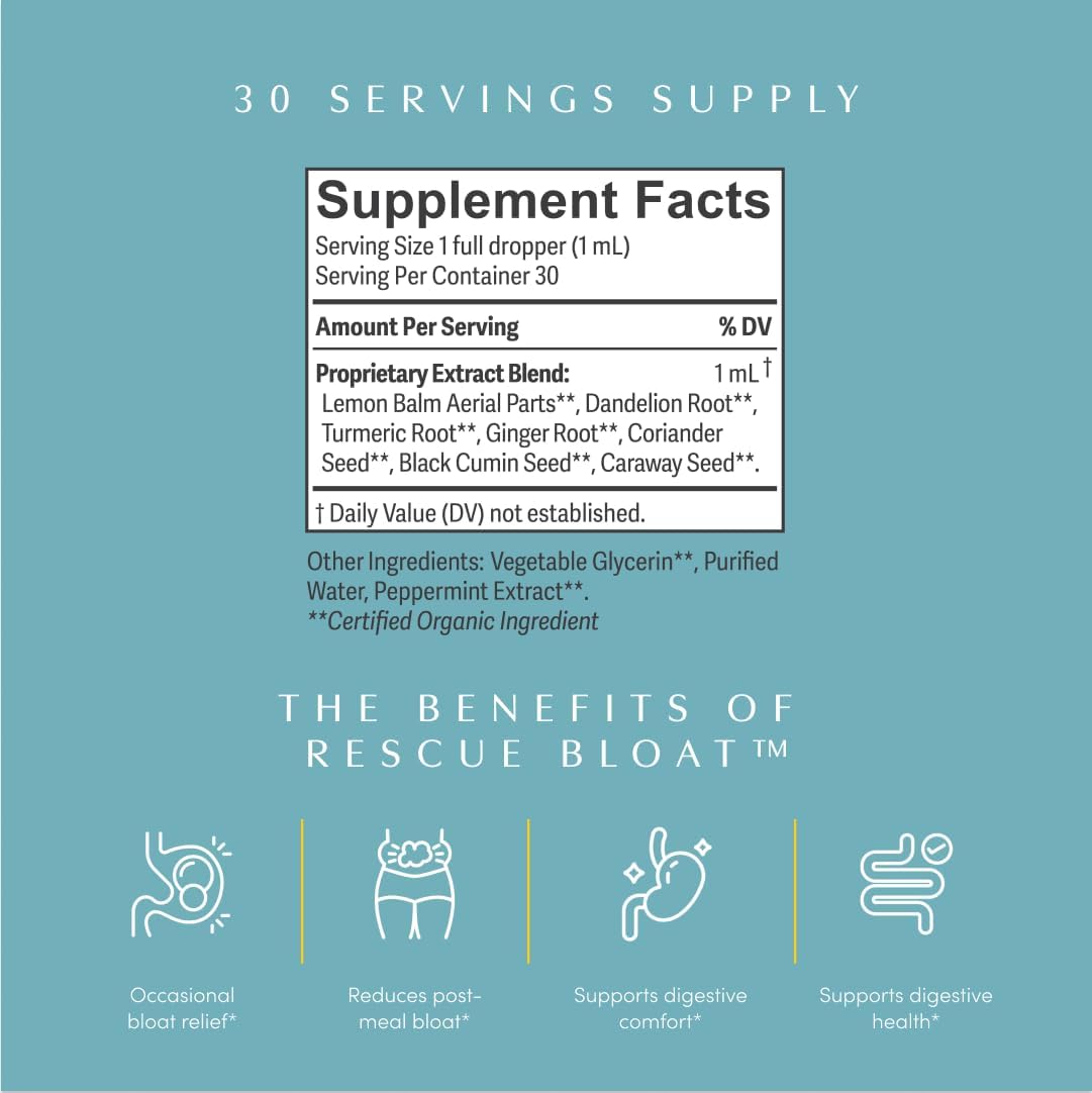 - DIGESTIVE DROPS FOR OCCASIONAL GAS & BLOAT SUPPORT: Rescue Bloat delivers powerful post-meal bloat and gas support, especially when you need it quickly. Formulated with peppermint, ginger, turmeric, lemon balm, and traditional digestive seeds like caraway, coriander, and nigella, Rescue Bloat is a potent post-meal aid that can help ease occasional discomfort associated with bloating and support digestive health.