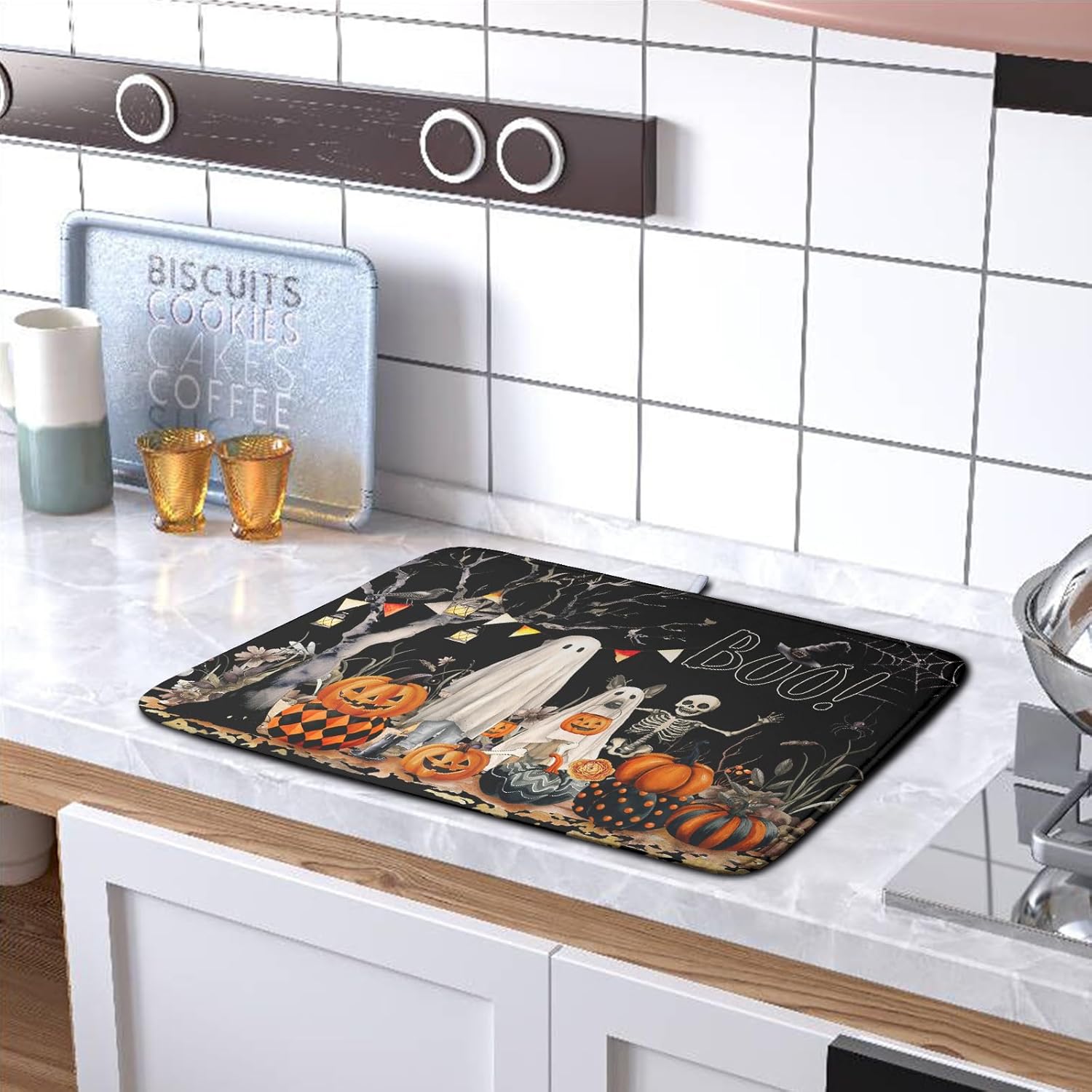 Halloween Dish Drying Mat for Kitchen Counter 16x18 Inch Black Ghost Pumpkins Dog Boo Skull Dishes Drainer Mats Absorbent Microfiber Washable Dish Draining Pad for Sink Coffee Bar