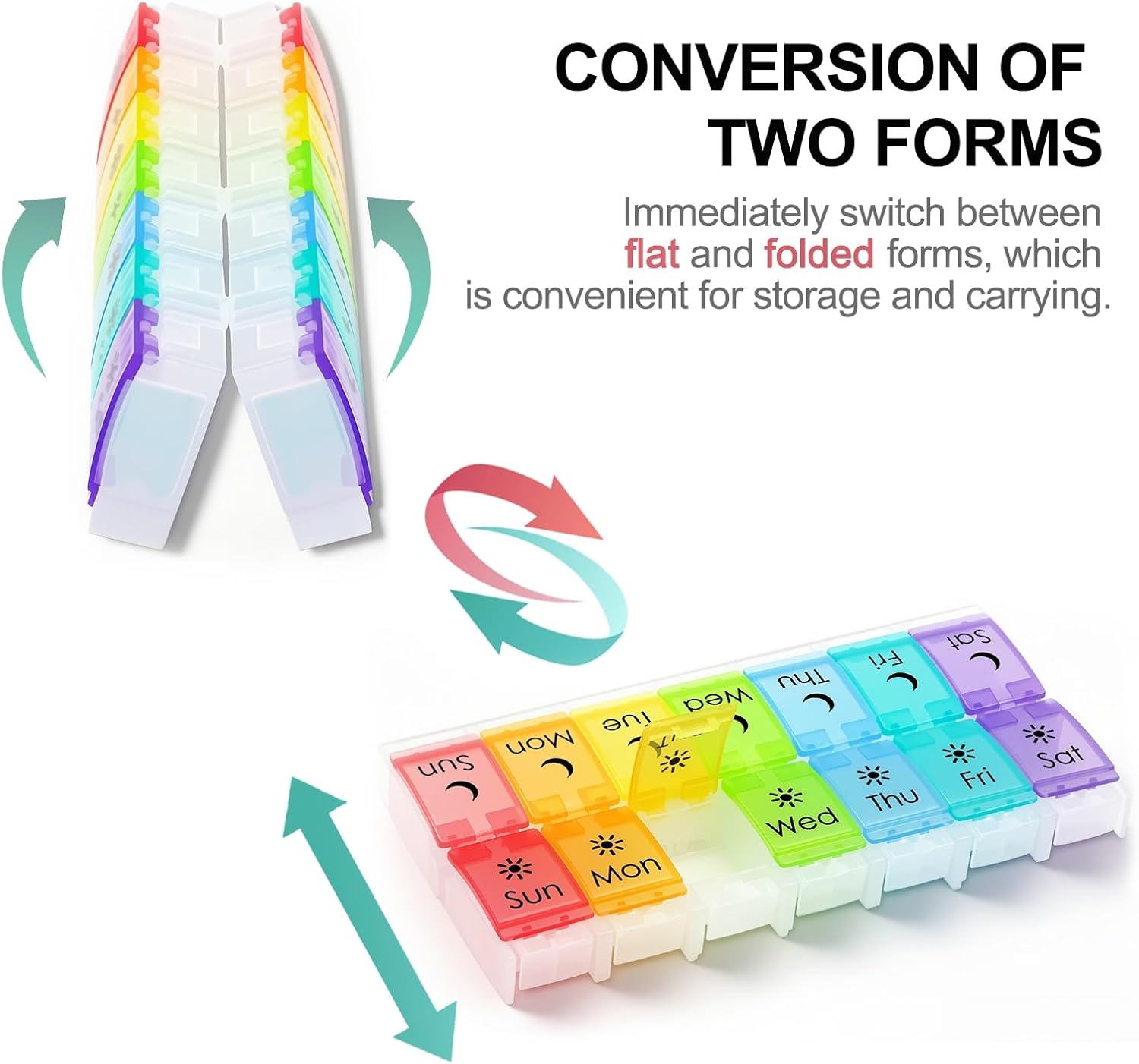 - LARGE COMPARTMENT FOR LARGE PILLS - Each Weekly Pill Box has 14 compartments, which are divided into AM PM parts, and can be tiled or folded. These compartments are designed according to larger pills, such as fish oil and multivitamin capsules. The size of the XL Large Medicine Box is enough to hold a variety of pills. You can store up to 300 pills and make a weekly pill plan.