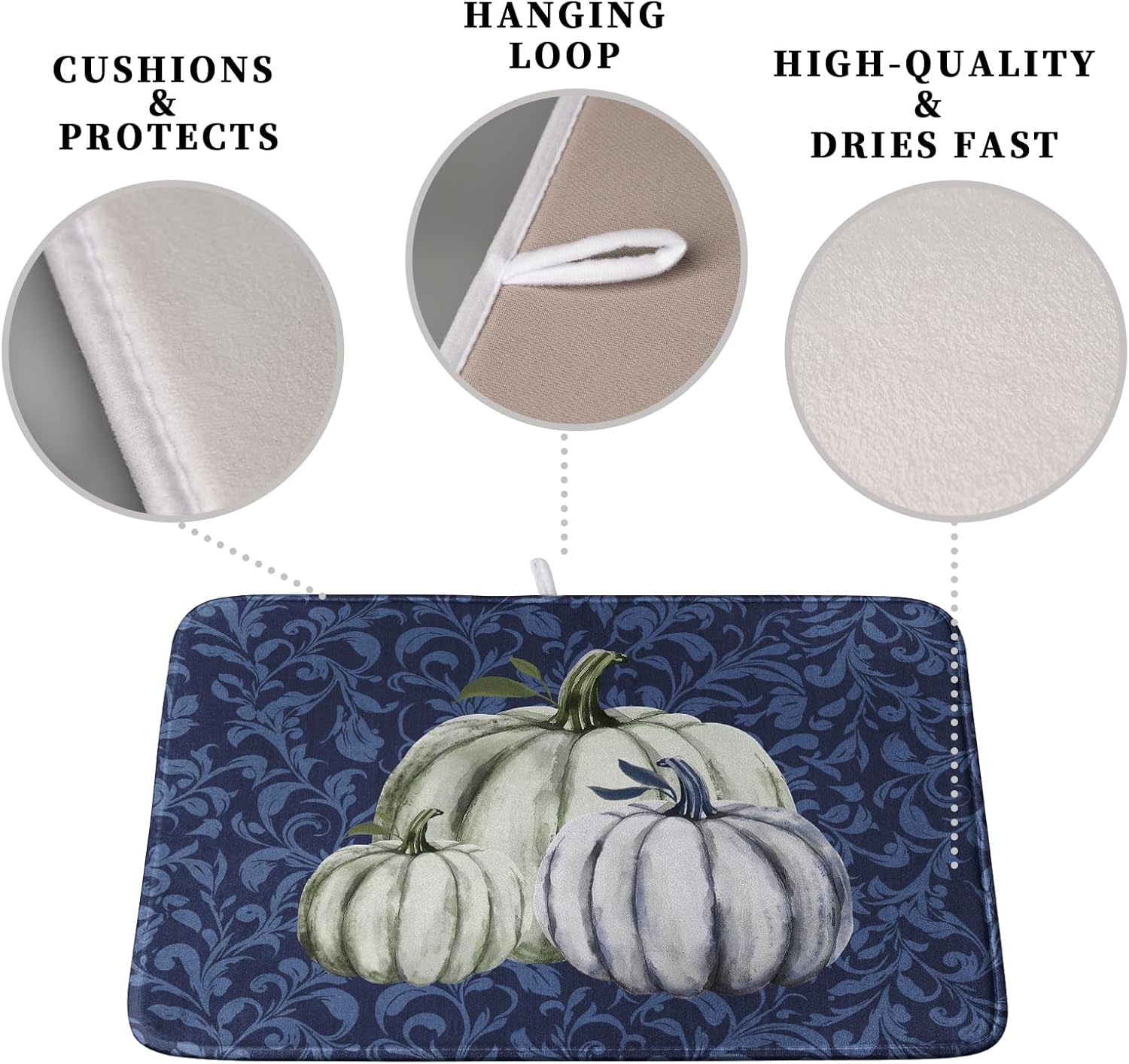 Autumn Dish Drying Mat Fall Navy Blue White Pumpkin Dish Pad for Kitchen Counter 18x24 Microfiber Absorbent Thanksgiving Dish Draining Mat Reusable Washable Dish Drainer Rack Mat