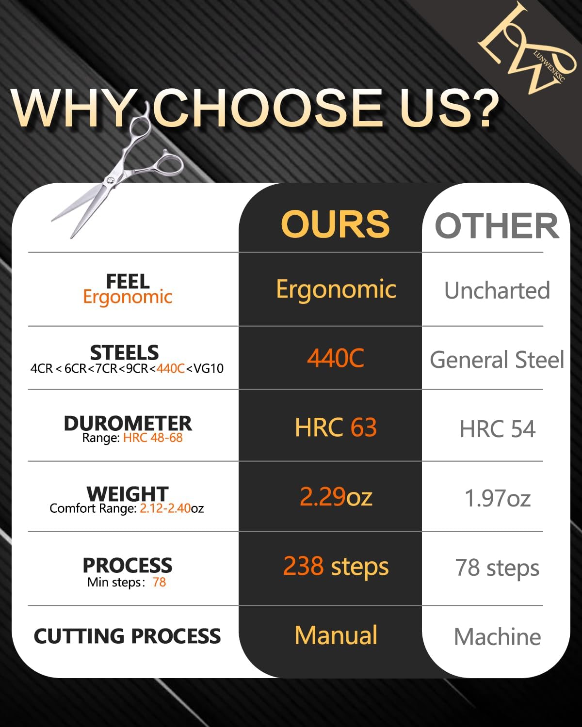 - JAPAN 440C STEEL: professional hair shears using Japan 440c steel, good steel to ensure the sharpness of the scissors, scissors hardness up to 63HRC