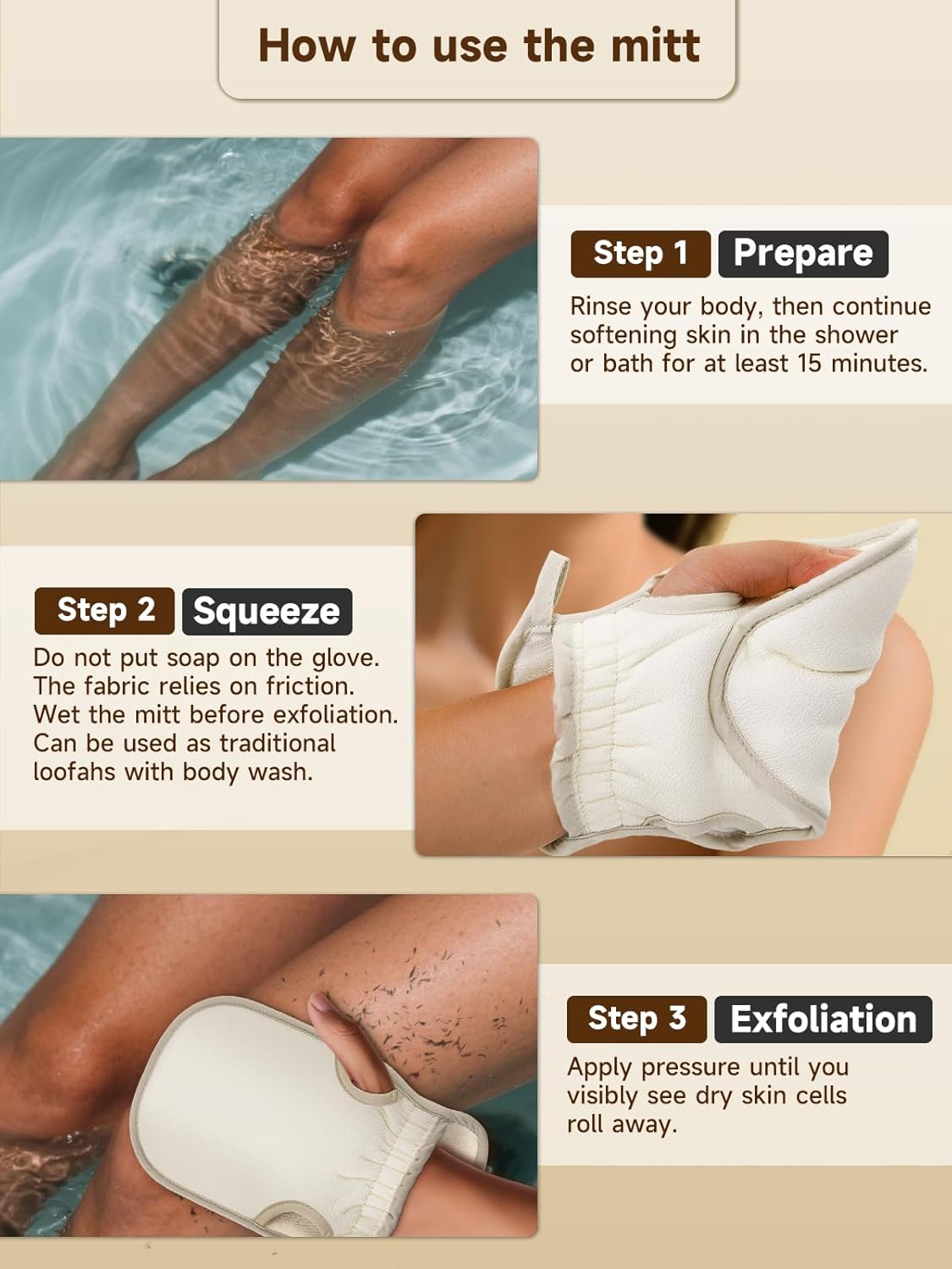 - Spa-like Deep Exfoliation: Provide spa-like experience into your self-care routine at home with deep moroccan exfoliating gloves. Our korean skin scrubber gives you the smoothest skin ever! Use this dead skin remover for body deep exfoliation 2–4 times per month, you’ll get improved skin texture, better product absorption, and fewer bumps & ingrown hairs, all while combating keratosis pilaris
