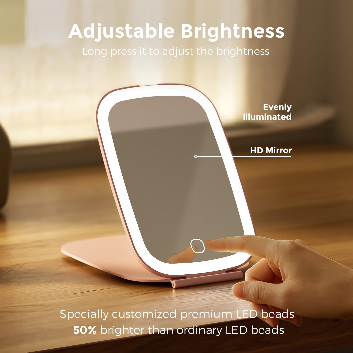 - 64 Customized LED Lights; The travel makeup mirror is up to 50% brighter than the regular 72 light beads, which can provide you with a bright and clear view of your makeup. You can long press the button to adjust the brightness that suits you