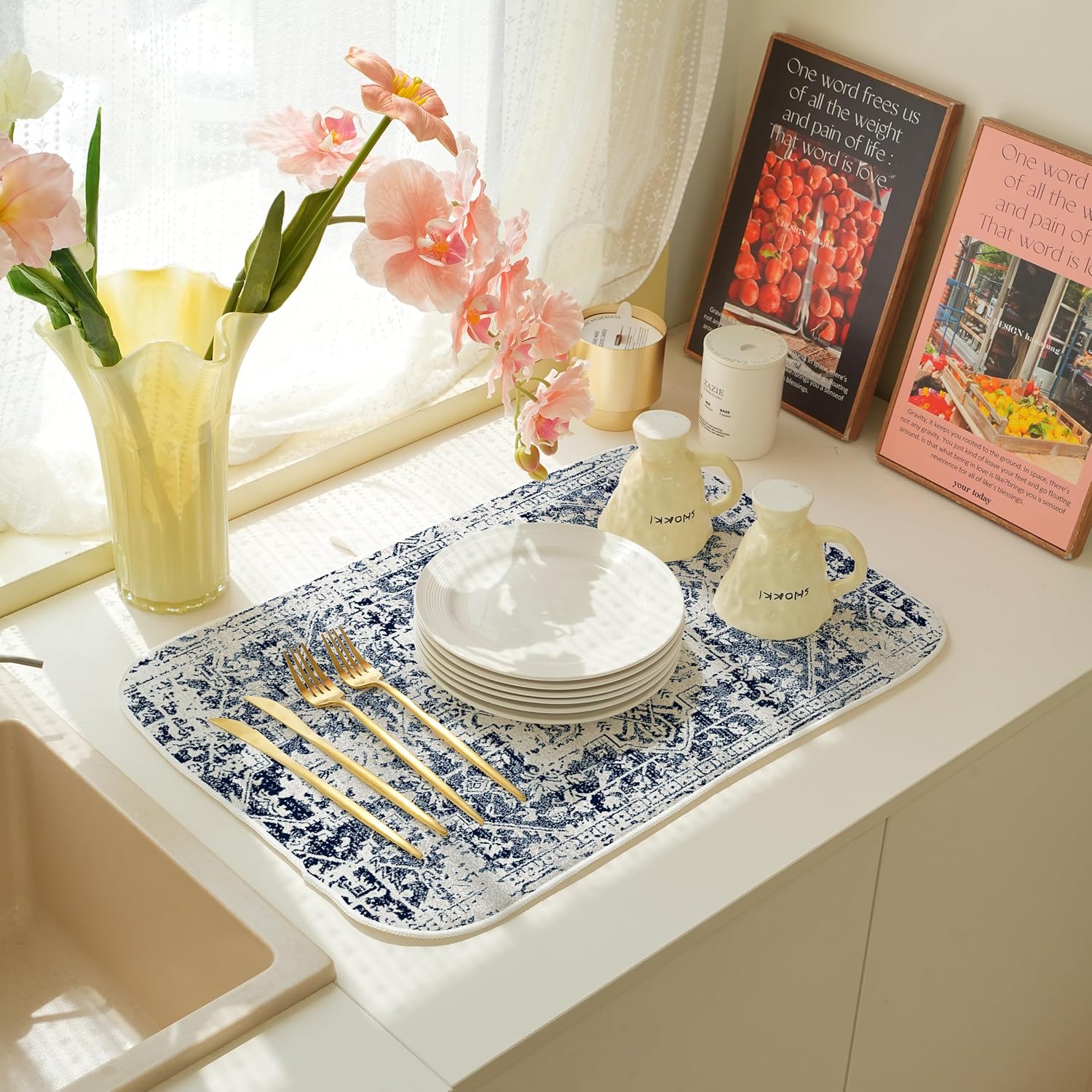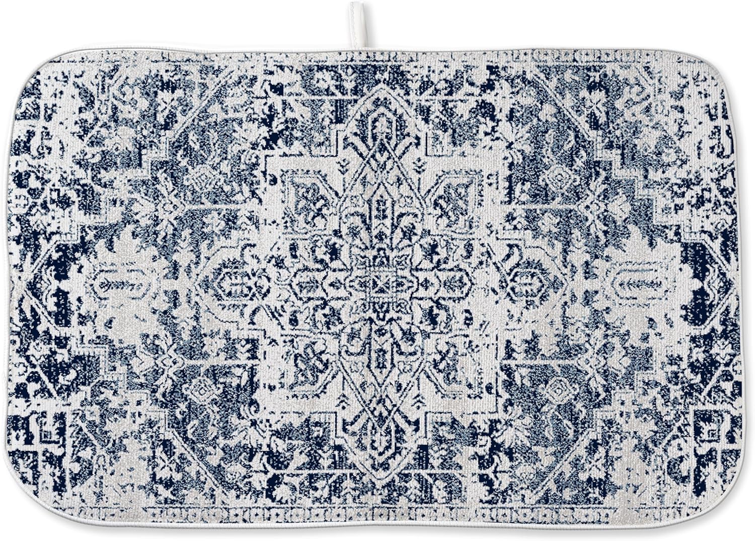 Blue Dish Drying Mat for Kitchen Counter, 18x24 Inch Blue White Boho Style Absorbent Dish Drying Pad Heat Resistant Mat Coffee Bar Mat Dish Drainer Rack Mat