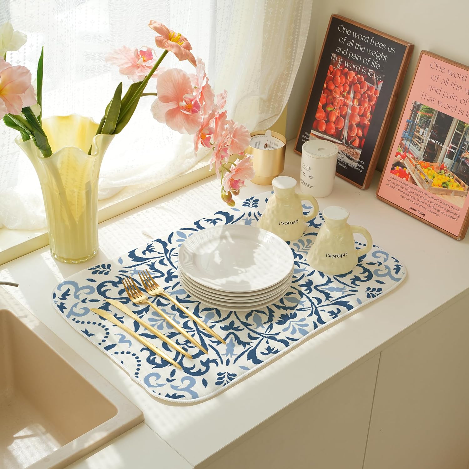 Blue Dish Drying Mat for Kitchen Counter, 18x24 Inch Navy Blue Boho Style Floral Absorbent Dish Drying Pad Heat Resistant Mat Coffee Bar Mat Dish Drainer Rack Mat