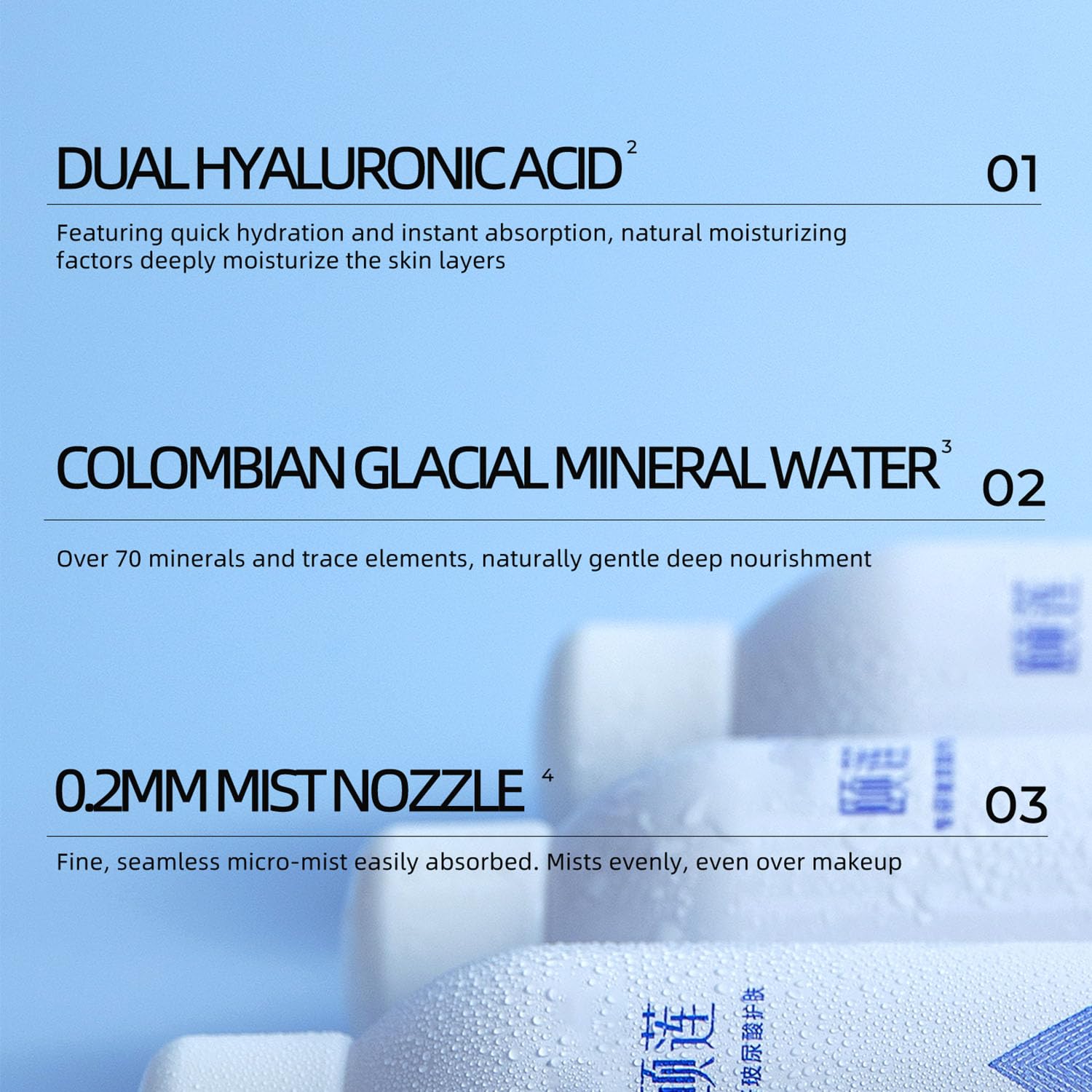 - This hydrating face mist features sodium hyaluronate (hyaluronic acid) and Columbia glacier mineral water, rich in over 70 beneficial minerals and trace elements. This facial mist spray hydration formula deeply hydrates without drying the skin.