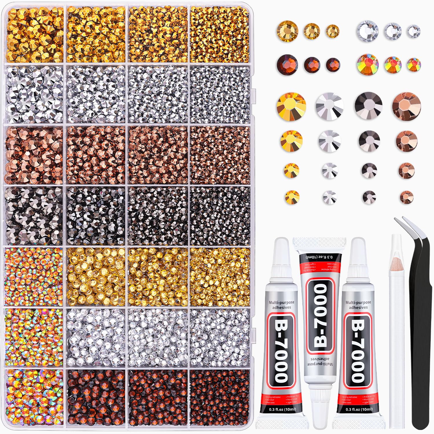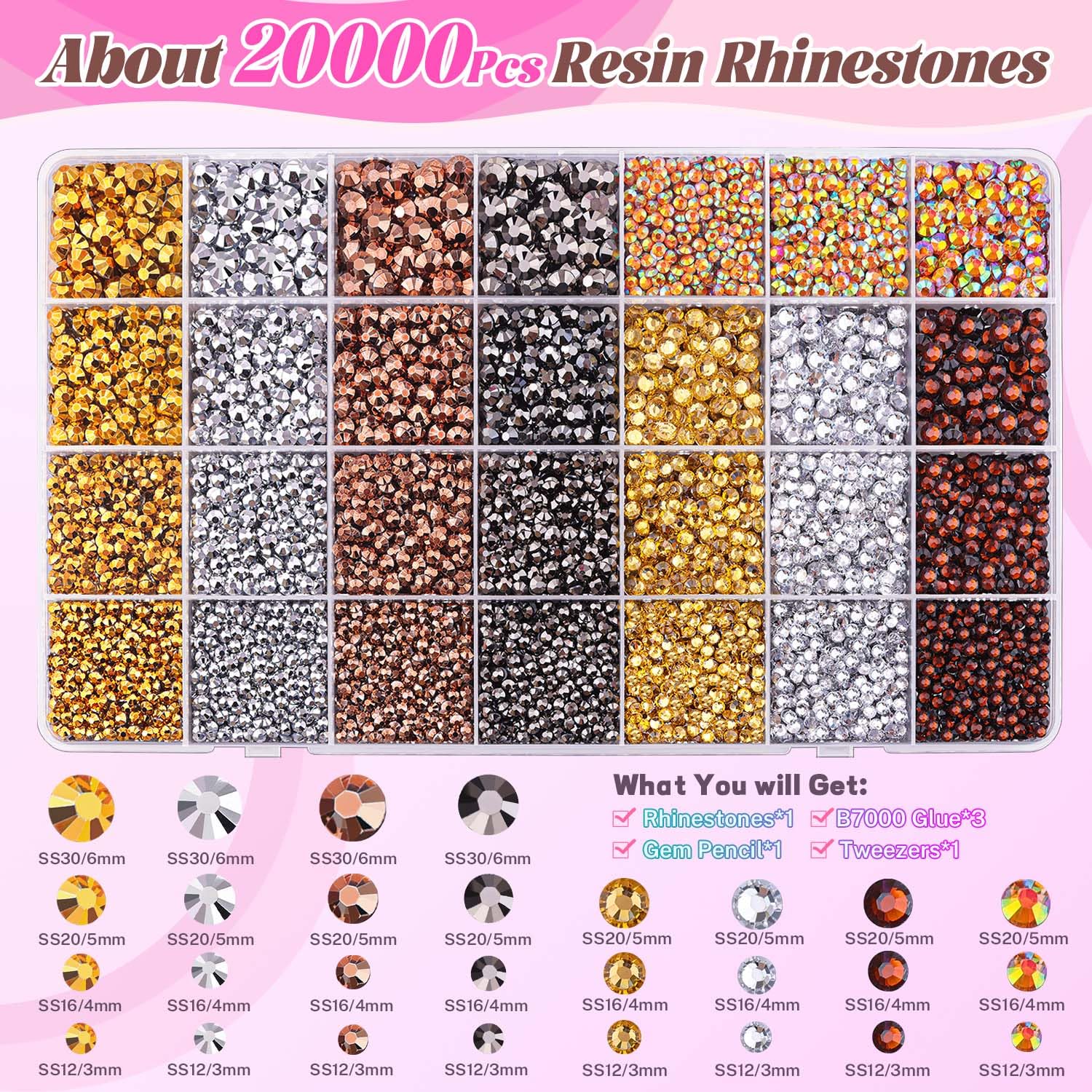 - PACKAGE CONTENT -- Include 1 box with 28 grids, featuring a variety of colors and sizes, approx. 20000 pcs bling-out resin rhinestones. 1 tweezers and 1 pickup pen are included for easily picking up of rhinestones. 3 B7000 glue for jewelry making. This all-inclusive set will meet all your needs to bedazzling your crafts