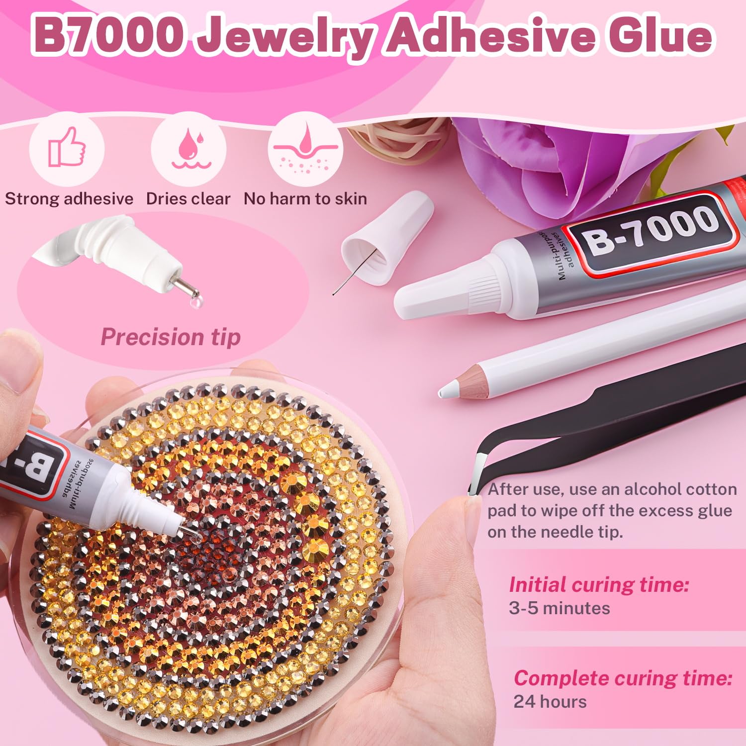 - STRONG B7000 CLEAR GLUE -- Strong adhesion and dries clear, precision needle for easy application and mess-free. The initial cure time is 3-5 minutes and the full cure time is 24 hours. After use, the needle should to be wiped with an alcohol pad