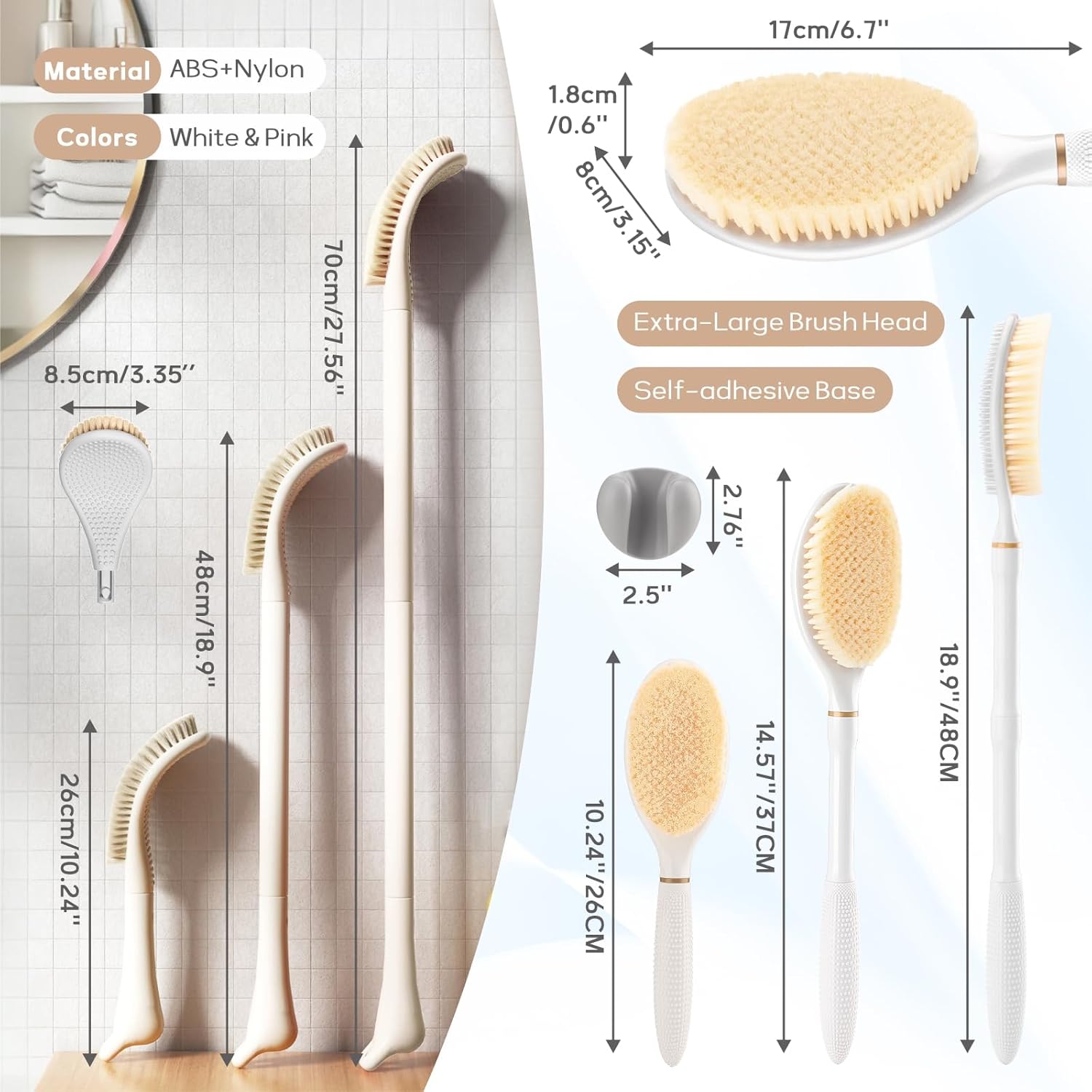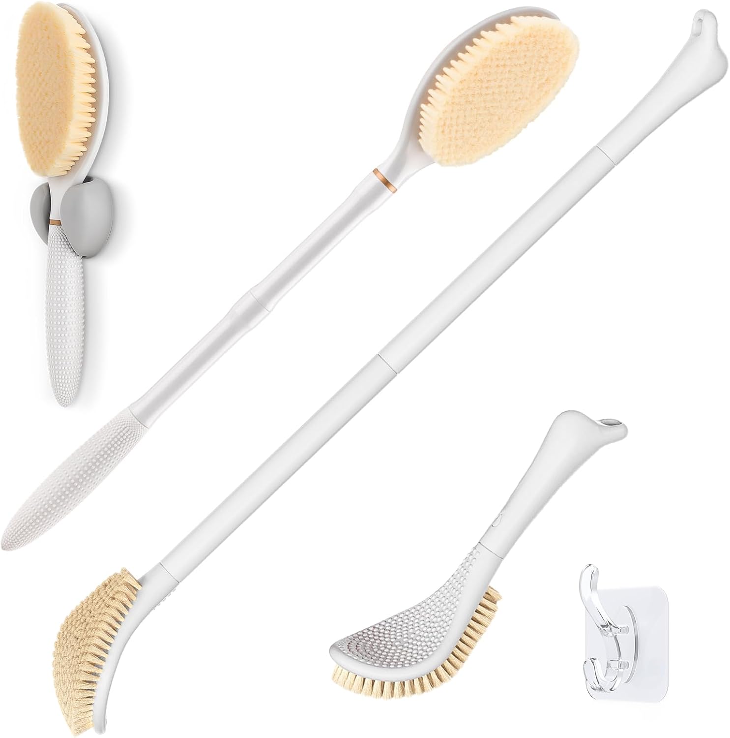 New Foot Brush & Back Scrubber Set 2PCS, 10.2''- 27.5'' Adjustable Foot Scrubber for Shower, 18.9'' Shower Back Scrubber with 3-Length Usage, Great Aid for People with Limited Mobility(White)