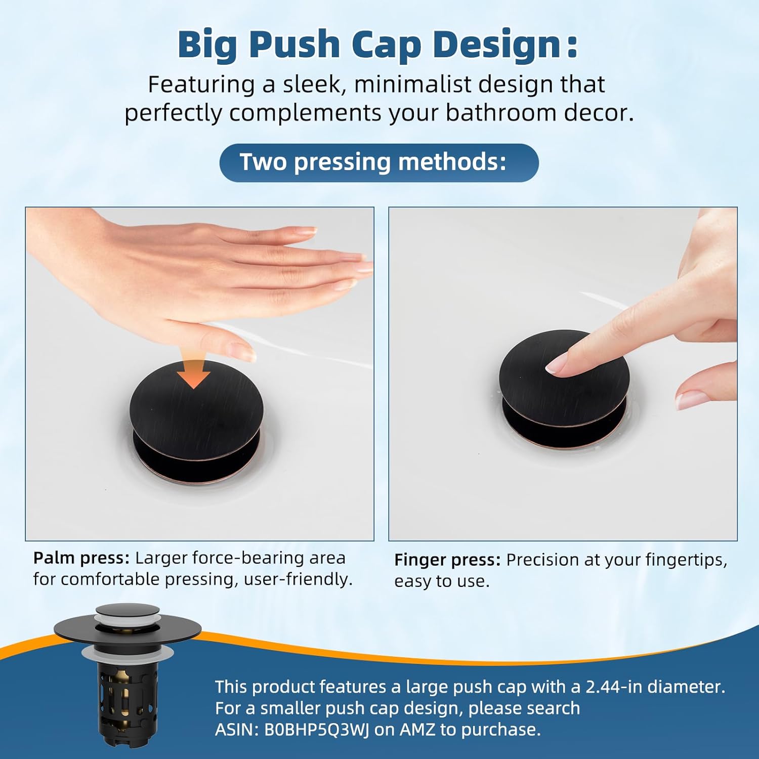 - [Pop-up Design with Big Push Cap] Our sink drain strainer is made of high-quality stainless steel, solid brass, and plastic, providing exceptional rebound strength, corrosion resistance, and long-lasting durability. It features a sensitive pop-up solid brass bullet core, allowing you to easily switch between the water storage and fast drainage with just a gentle press. The large metal push cap has an innovative design that allows both finger and palm pressing for a more comfortable experience