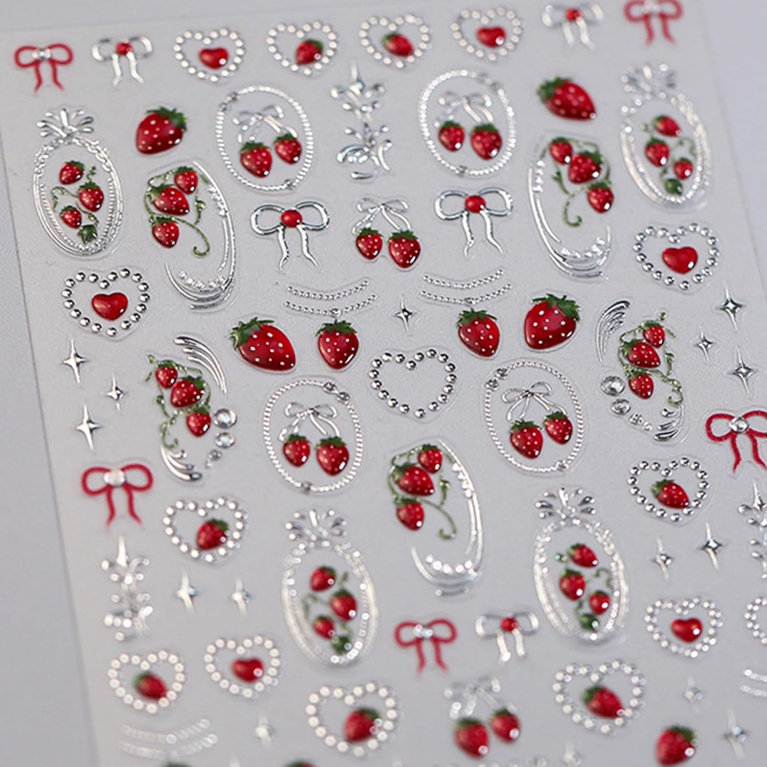 1Sheet Cherry Nail Stickers Summer Nail Decals 5D Embossed Bow Cherry Hot Stamped Gold Bow Heart Shape Star Jelly Design Summer Nails Supplies Pearl Chain Exquisite Nail Decor for Women DIY Manicure