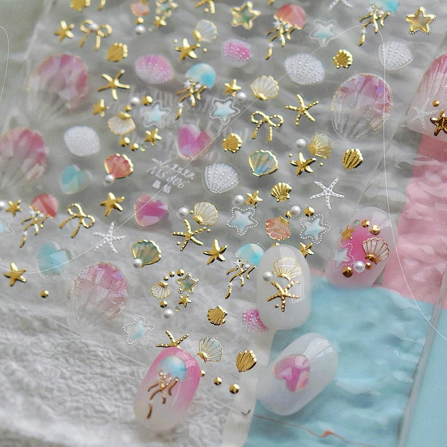 2Pcs Summer Nail Stickers for Nails Art,Self-Adhesive Star Shell Nail Art Stickers Seashell Nail Decals Starfish Jellyfish Pearl Nail Designs 5D Embossed Ocean Life Nails Supplies for Women Manicure