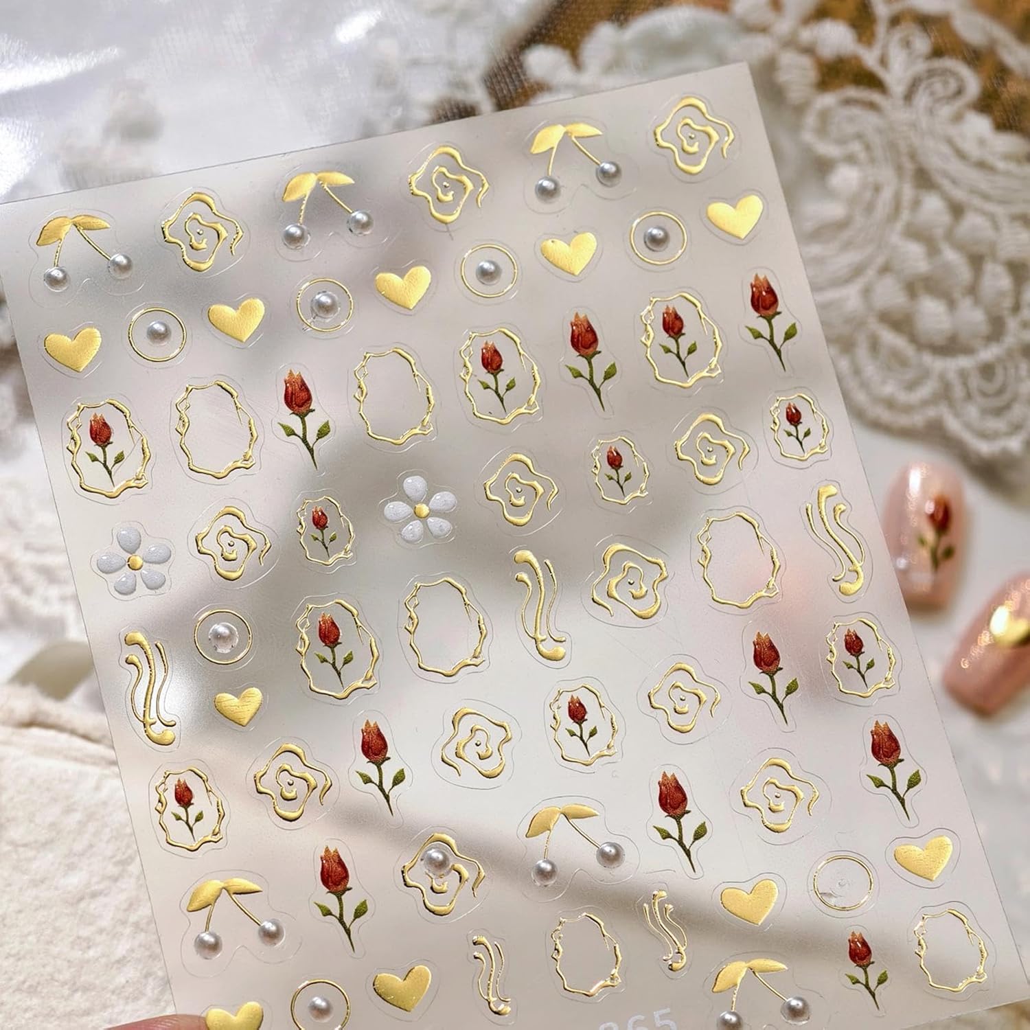 Gold Nail Stickers Flower Nail Decals for Nails Art Tulip Nail Art Stickers with Design Heart Nails Art Decals Self Adhesive Sticker for Women Girls Kid Manicure Charms Supply Accessories
