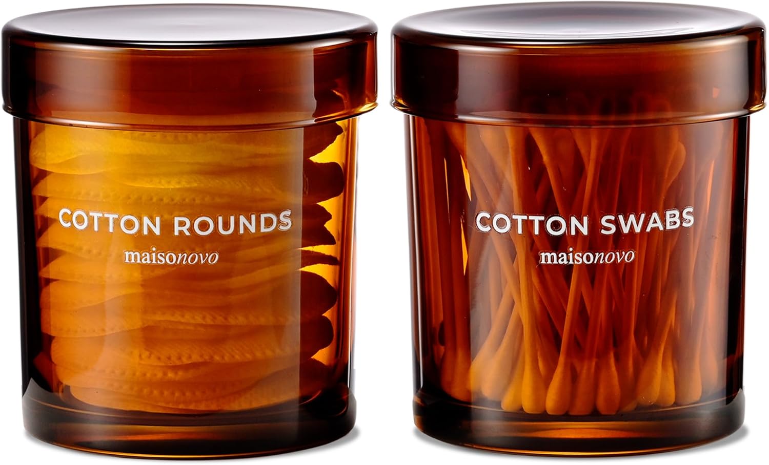 MaisoNovo Qtip Holder Bathroom Set – Airtight Glass Qtip Holder with Lid to Store Q Tips, Cotton Rounds, Cotton Balls, Floss Picks, Hair Ties with free labels pack - 2 Amber Jars with Glass Lids