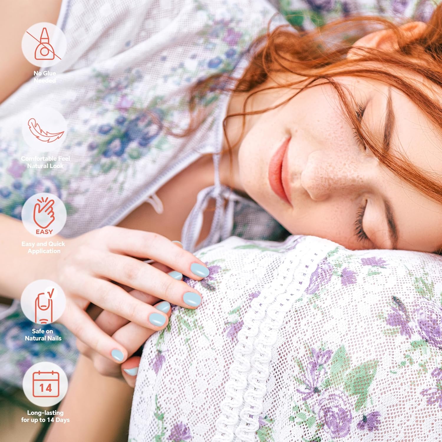 Semi Cured Gel Nail Strips-Natural Looking False Nails, Glue on Nails Full Cover for Daily Use & Homemakers Works with Any UV/LED Lamps(Sky Blue)