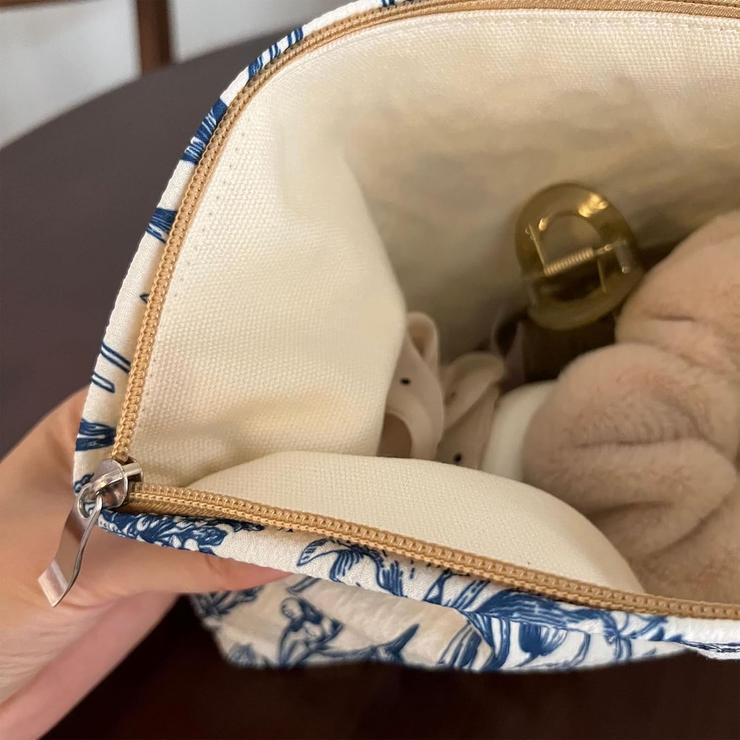 Wudygirl Cute Makeup Bag for Women - Travel Cosmetic Bag with Zipper Makeup Pouch Floral Make up Organizer Handbag Aesthetic (Porcelain Blue)