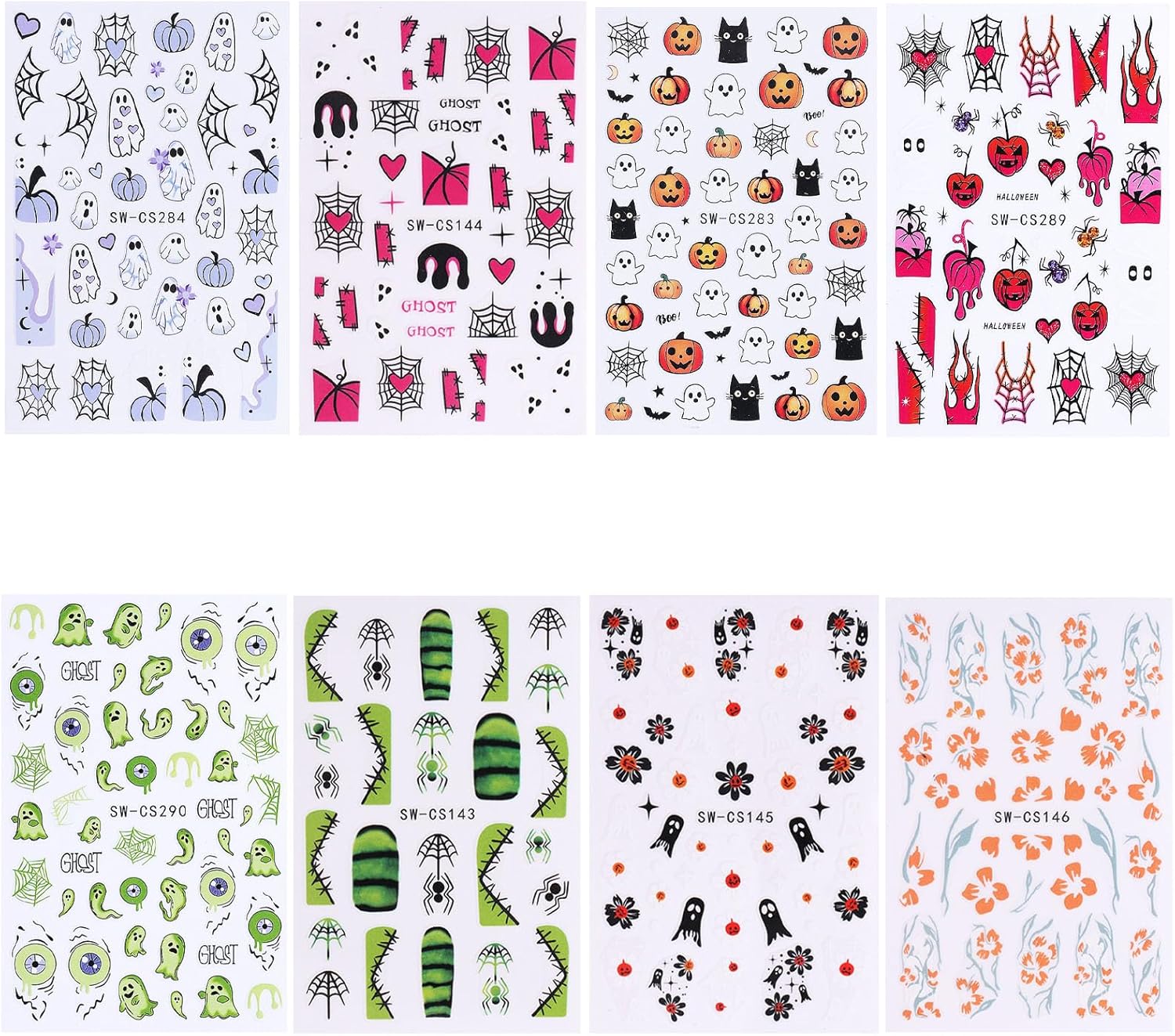 Halloween Nail Art Stickers for Nail Art Cute Pumpkin Nail Stickers Self Adhesive Nail Design Ghost Spider Web Bat Flower Heart Cat Nail Decals for Women Girls DIY Manicure 8 Sheets
