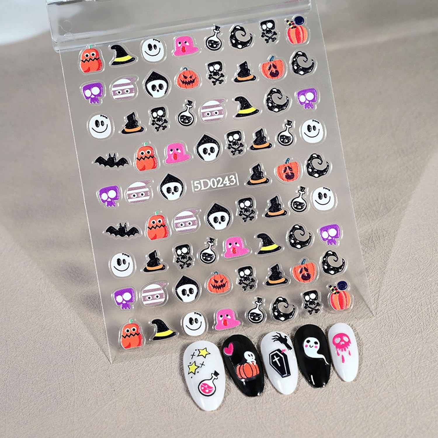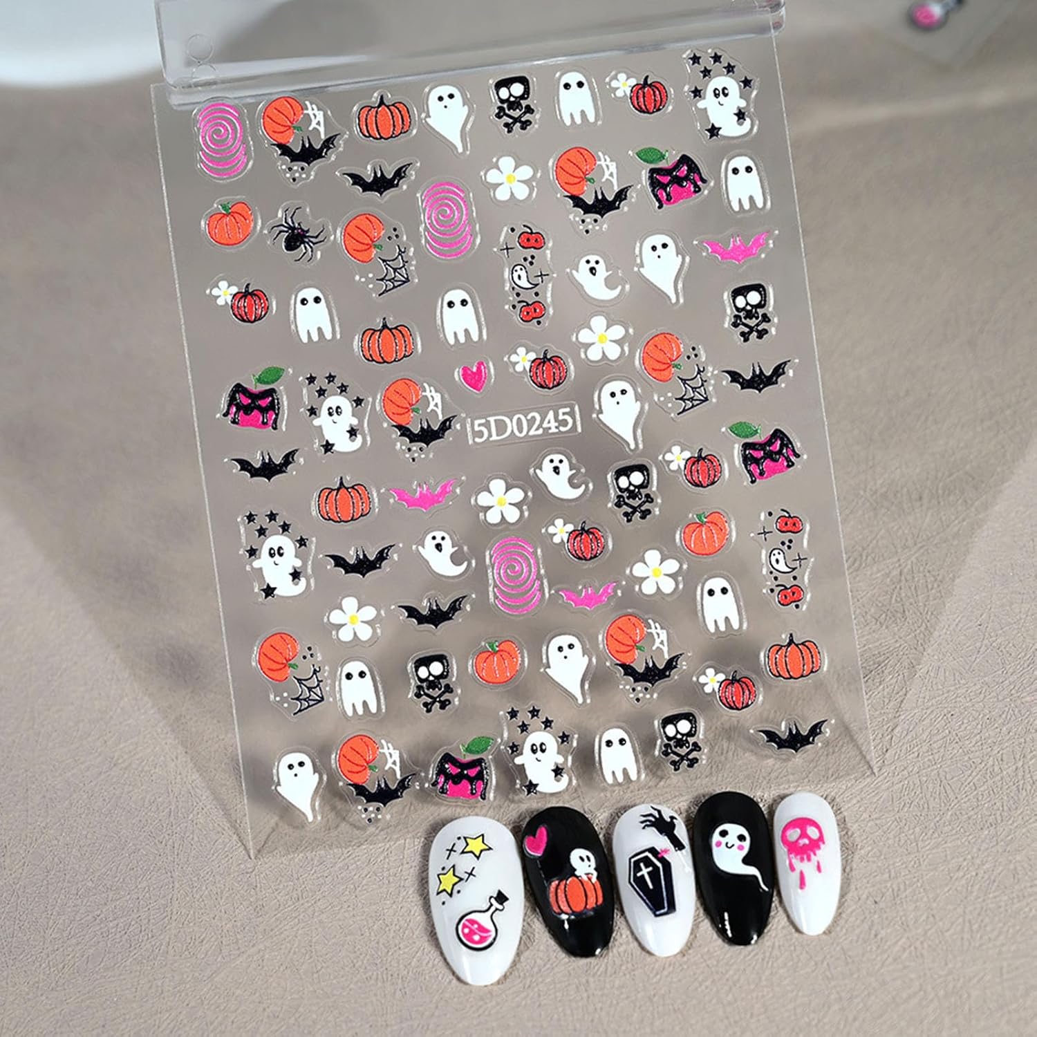 6 Sheets Halloween Nail Stickers for Nail Art 5D Self Adhesive Cute Ghost Nail Art Stickers with Pumpkin Bat Blood Drop Skeleton Design Sticker for Women DIY Nails Decoration