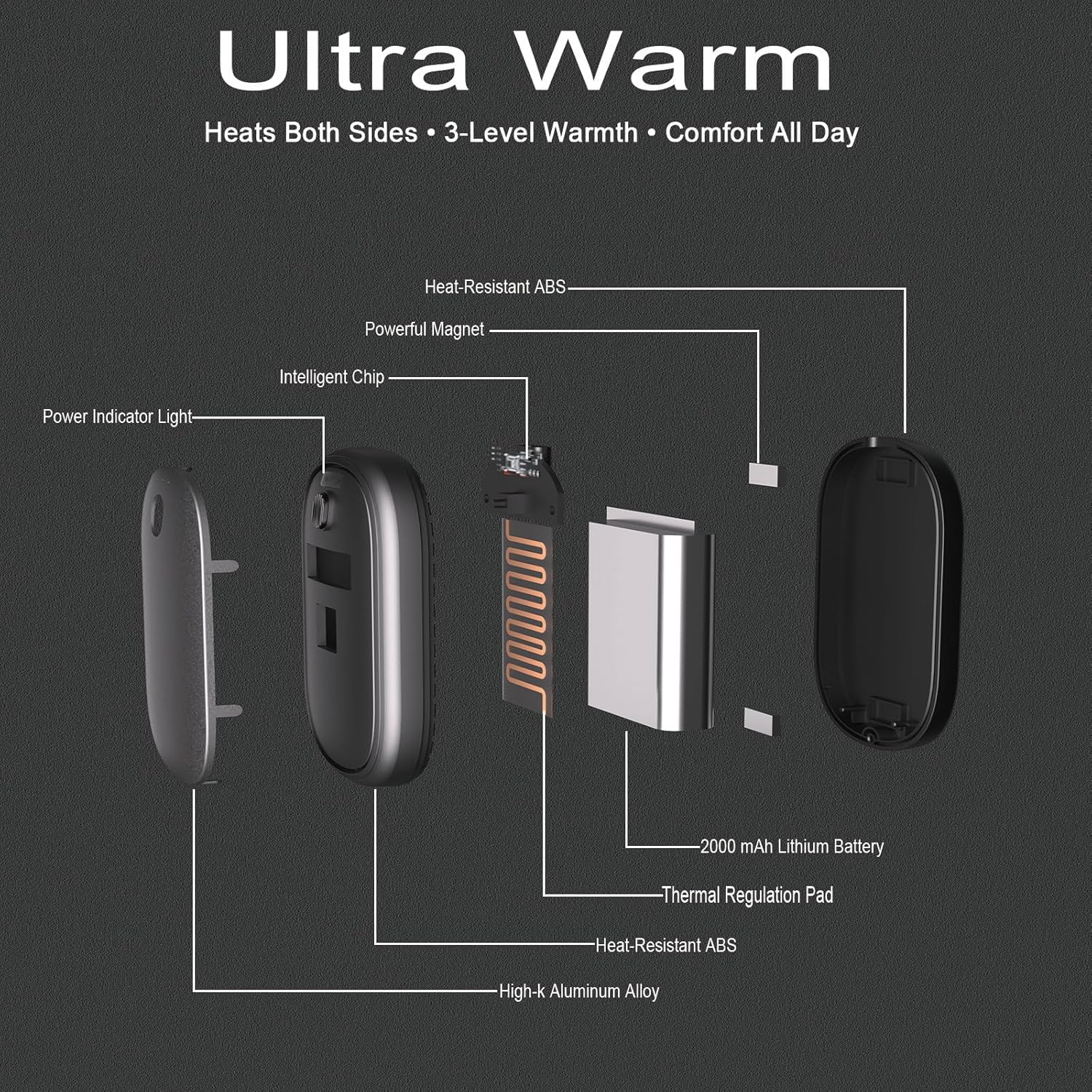 - MAGNETIC 2-IN-1 VERSATILITY : Enjoy warmth by using one in each hand, or snap these rechargeable hand warmers together magnetically for easy storage and shared heat. The included dual-port charging cable fuels both hand warmers simultaneously, eliminating wait time and hassle