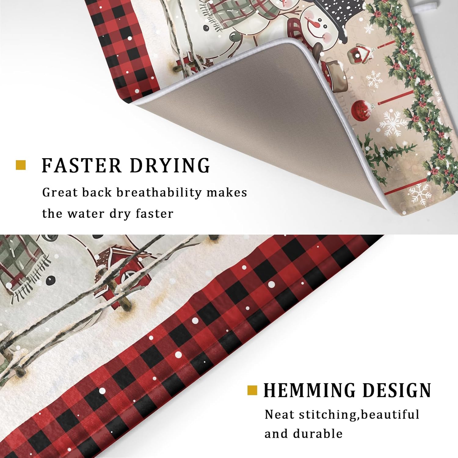 Winter Snowman Dish Drying Mat 18x24 Inch Red Buffalo Plaid Holiday Dish Drainer Mat Absorbent Dish Rack Pad for Kitchen Counter Sink Decor