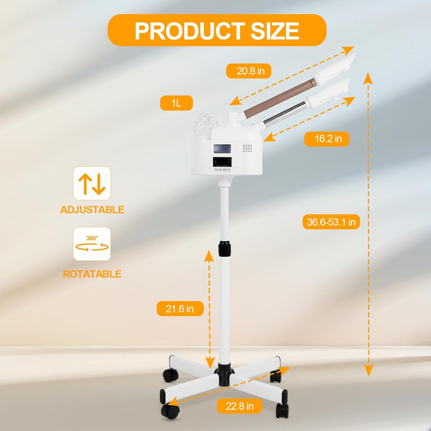 - 【Height Adjustable】This professional facial steamer has an adjustable height of 36.6-53.1 inches. 360° rotatable nozzle, 360° rotatable main body for lying down or sitting down to enjoy your facial spa, and the best steaming time is 15-20 minutes.