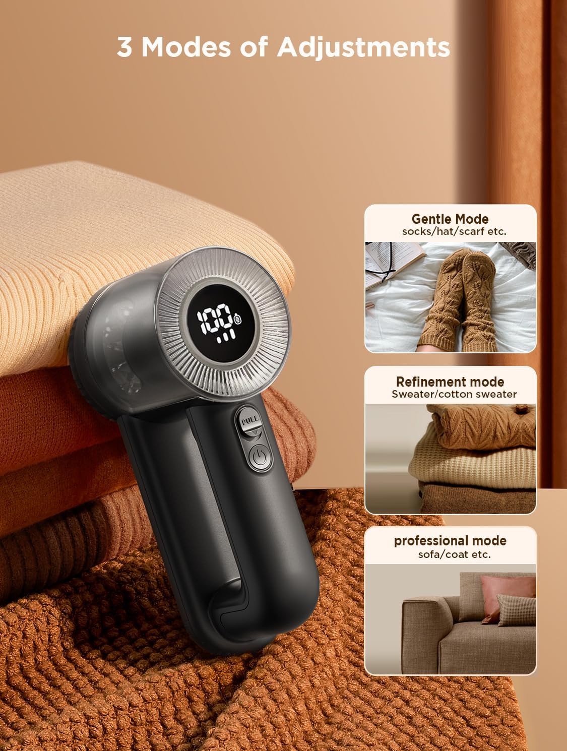 - Convenient LED Digital Display: This fabric shaver for clothing clearly shows the battery leve and speed level, so you’ll never be caught off guard by a dead battery. Plus, it makes mode selection a breeze, letting you use the device easily and efficiently.