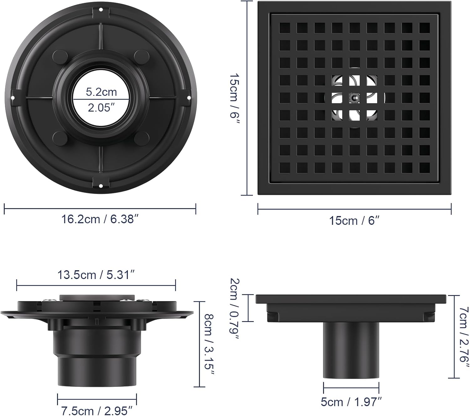 - 【Standard Universal Type】 This 6 × 6 inch square black shower drain cover features a standard 2-inch central drain outlet—compatible with standard US NO-HUB Drain Base Systems. Its precision-engineered grating effectively traps debris and hair, ensuring unobstructed drainage.