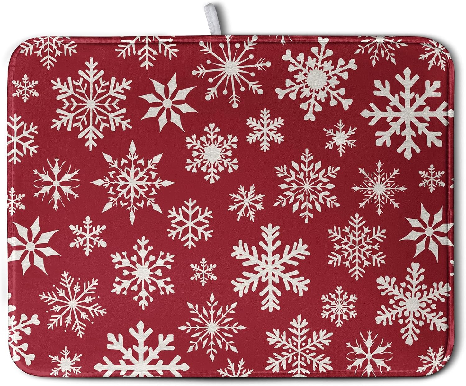 Christmas Snowflakes Dish Drying Mat for Kitchen Counter 18x24 Inch Red White Winter Xmas Pattern Dish Drying Pad for Dishes Microfiber Absorbent Dish Drainer Rack Mats for Countertop