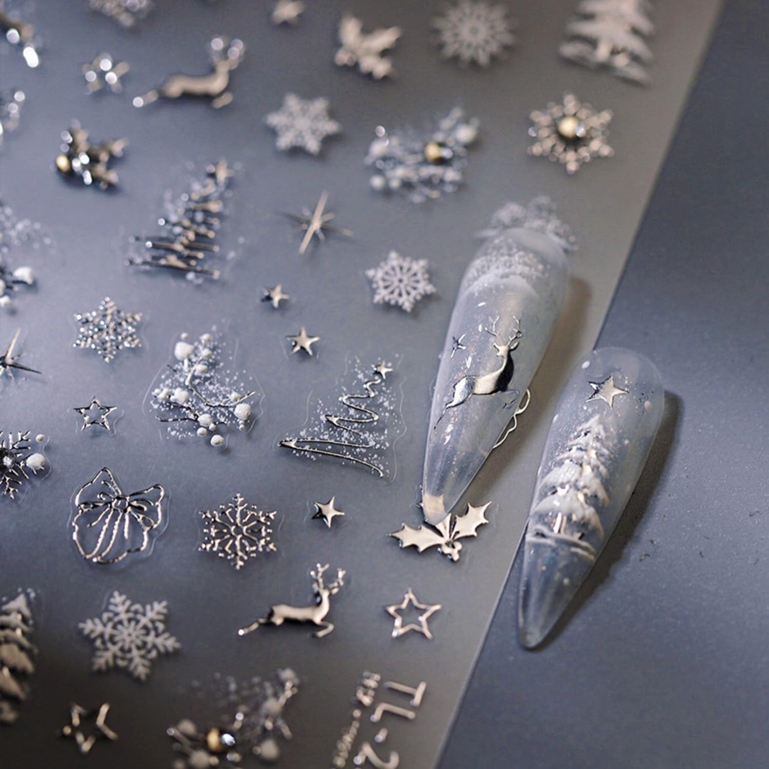 Christmas Nail Stickers for Nail Art Glitter Silver Reindeer Christmas Tree Nail Art Stickers Winter Xmas 5D Embossed Nail Decals 3D Self-Adhesive Nails Supply Manicure Sliders for Nails Decoration