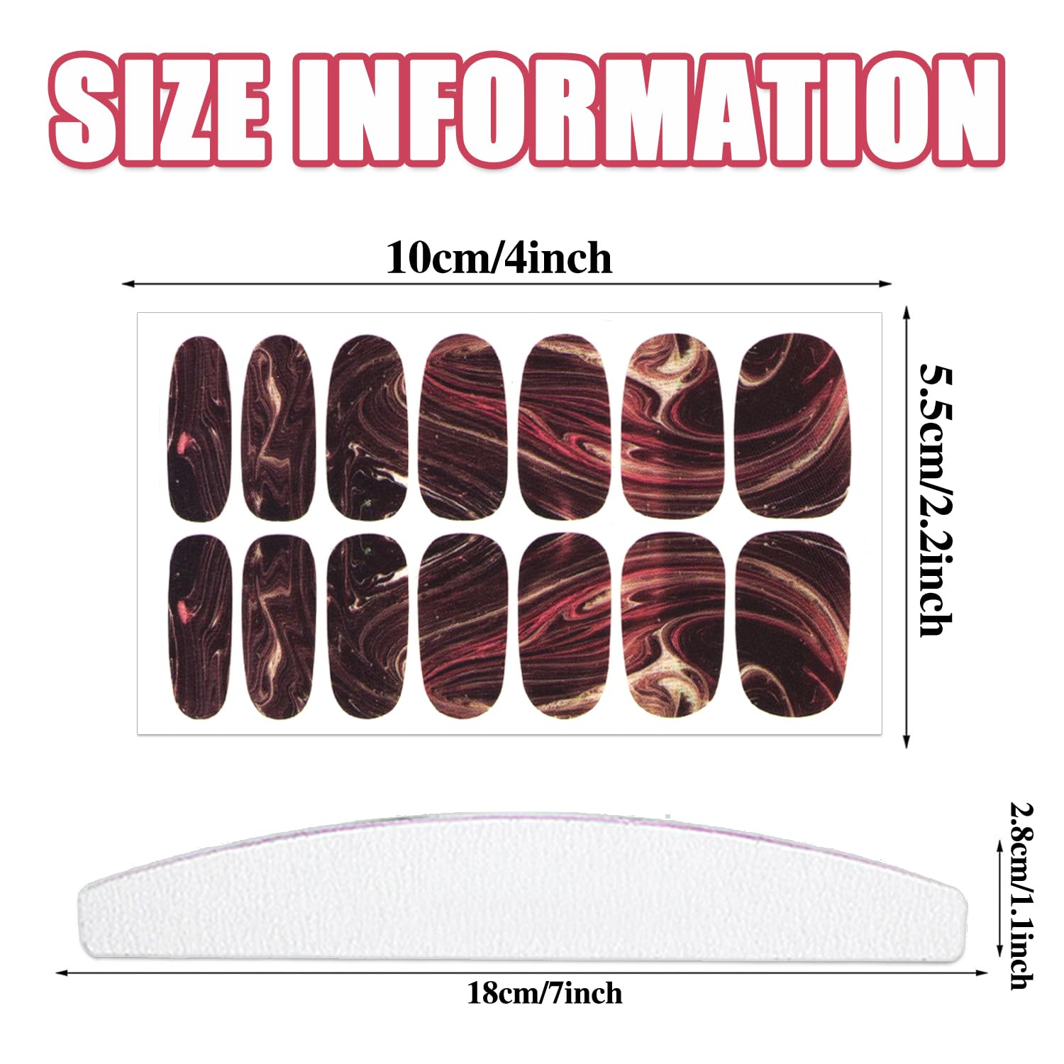 - PACKET CONTENT: 20 sheets nail polish strips full nail wraps+ 1pc moon shape nail art files, each sheet strips includes 14 tips with 7 different size to meet large-scale sizes of nails and replace in daily life.