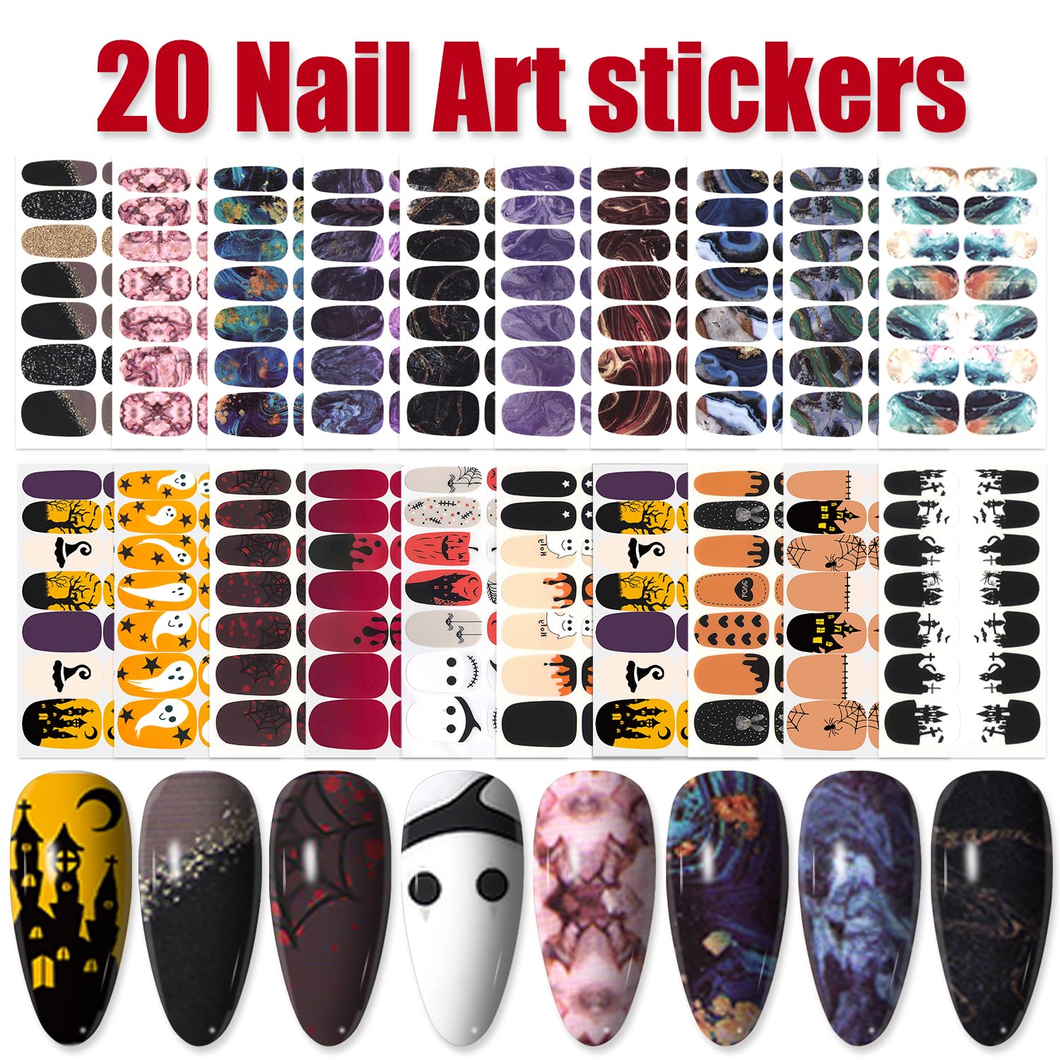 - VERY EASY TO USE: Our Halloween full nail wraps are self adhesive , No drying time and sticky well. Chose any design you like and a size fitted to stick on nails gently, and just peel it off when you want to remove it , nothing would hurt your nails but protect them ! (You can read the details of instruction in the description under this page)