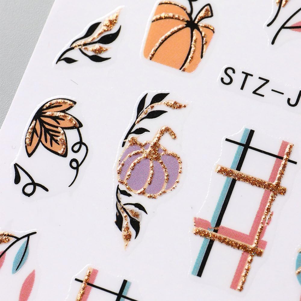 Fall Nails Stickers Autumn Leaves Nails Sticker 3D Embossed Maple Leaves Self Adhesive Sticker Nail Decals Glitter Pumpkin Thanksgiving Nail Art Decal Fall Decals for Nail DIY Manicure 4Sheet