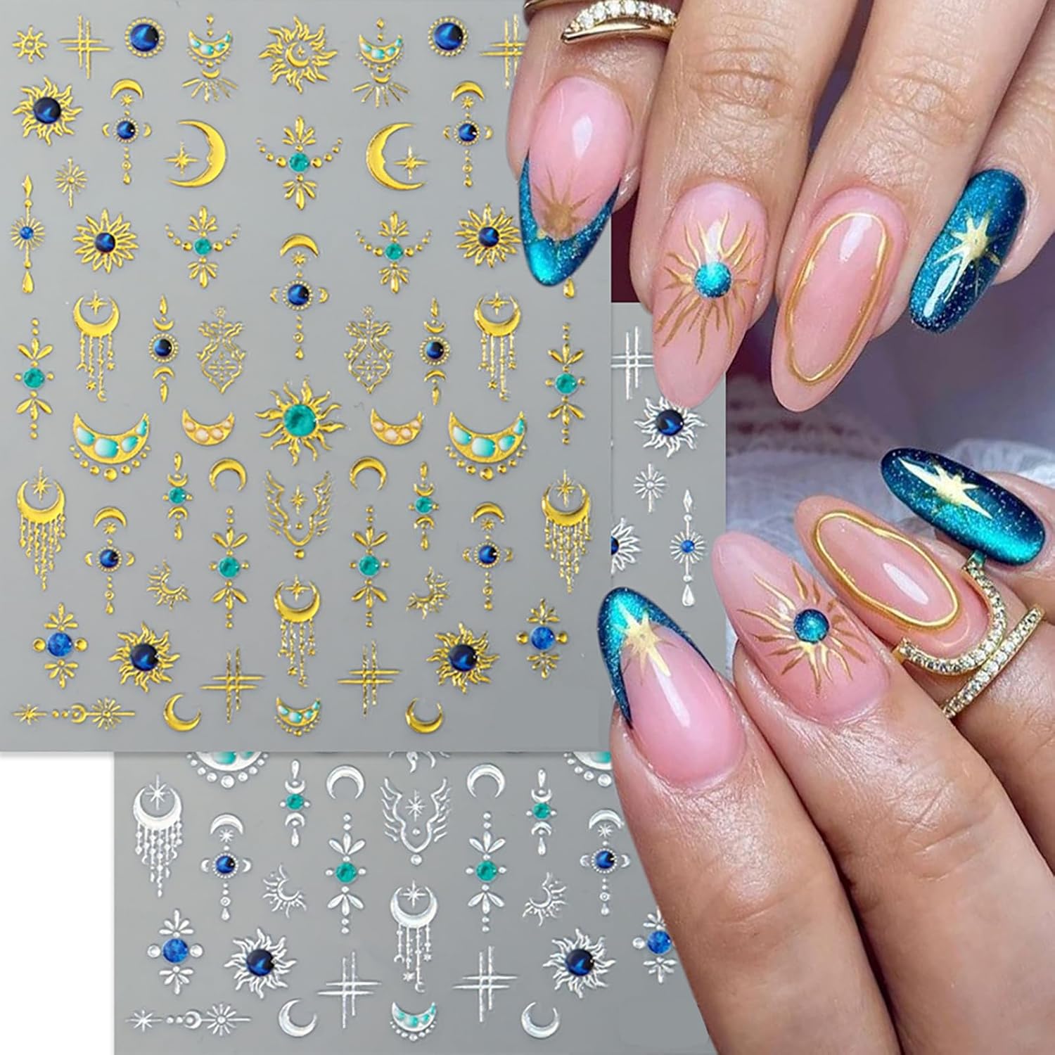 5D Nail Stickers for Nail Art Sun Moon Nail Decals Shiny Bohemian Style Nail Art Supplies Luxury Silver Gold Flower Star Moon Sun Nail Adhesive Stickers Fall DIY Manicure Supplies for Women 4PCS