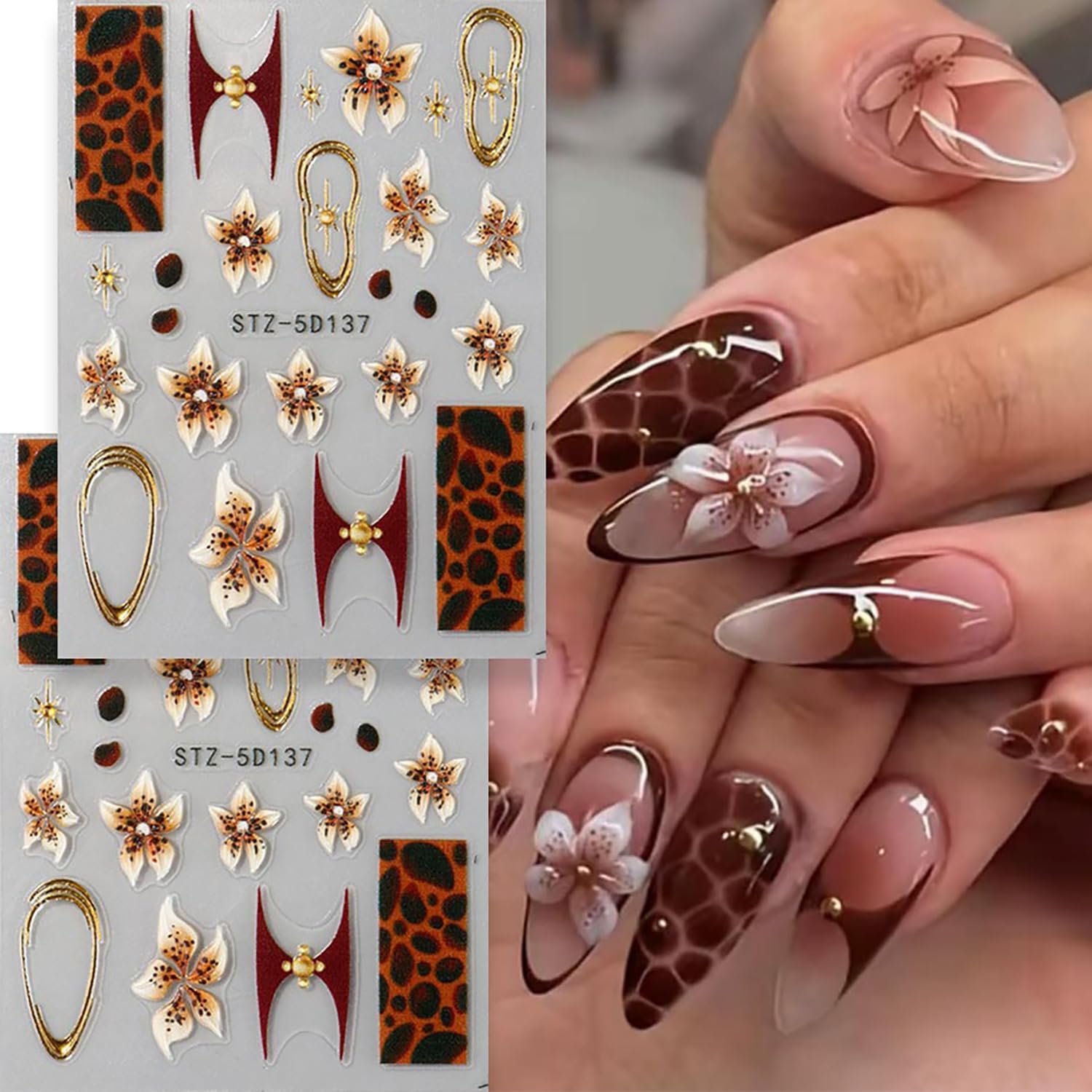 - 【Premium Nail Sticker Set with Diverse Designs】Includes 2 sheets of high-quality brown flower leopard print nail stickers featuring popular patterns like floral, leopard print, and glitter designs. Each sticker measures 7.8 x 6 cm (3.07x 2.36 inches), ideal for natural and artificial nails