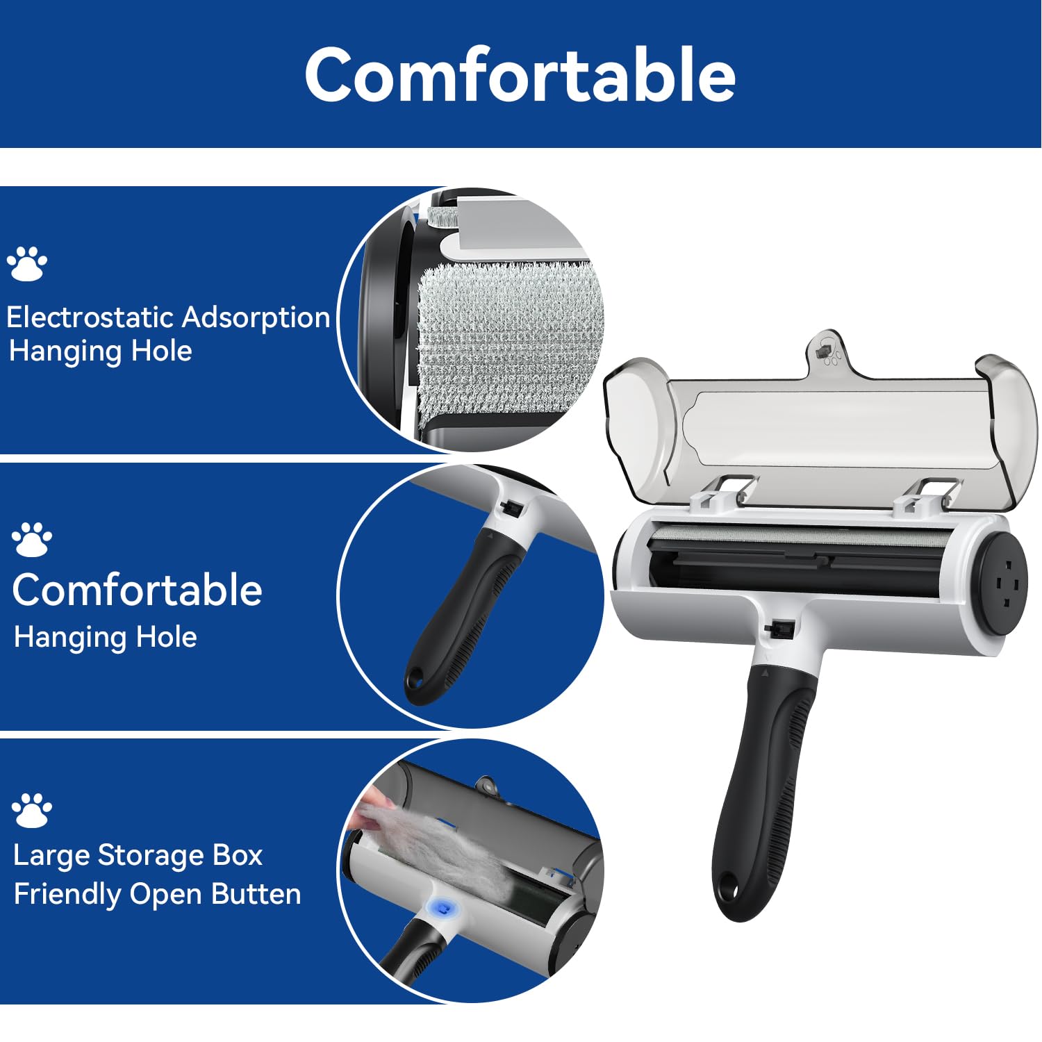 - Self-Cleaning Fur Bin – No sticky tape, no mess, no refills. Simply roll back and forth, and the built-in receptacle collects all the pet hair. One press of the button opens the bin for quick and easy emptying.