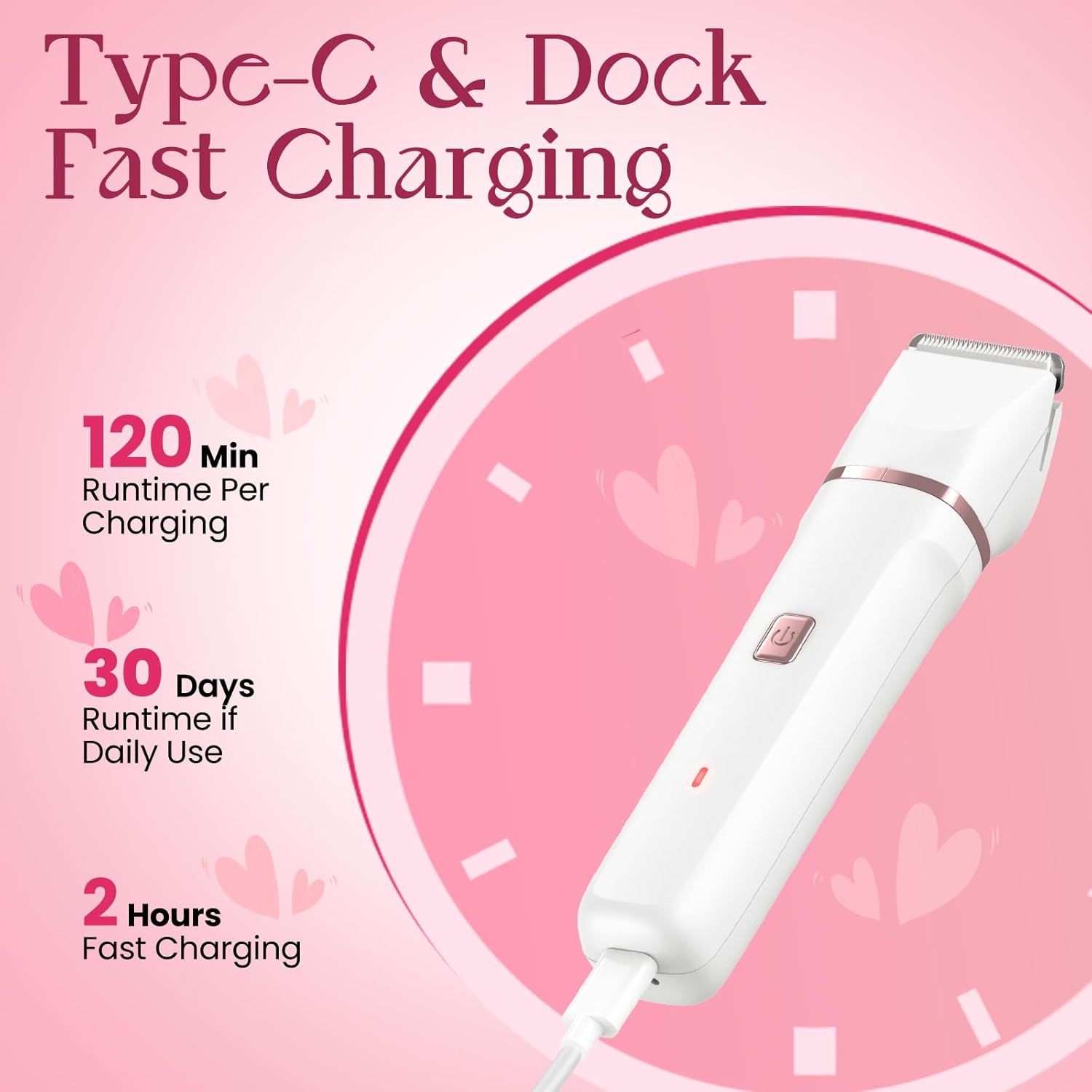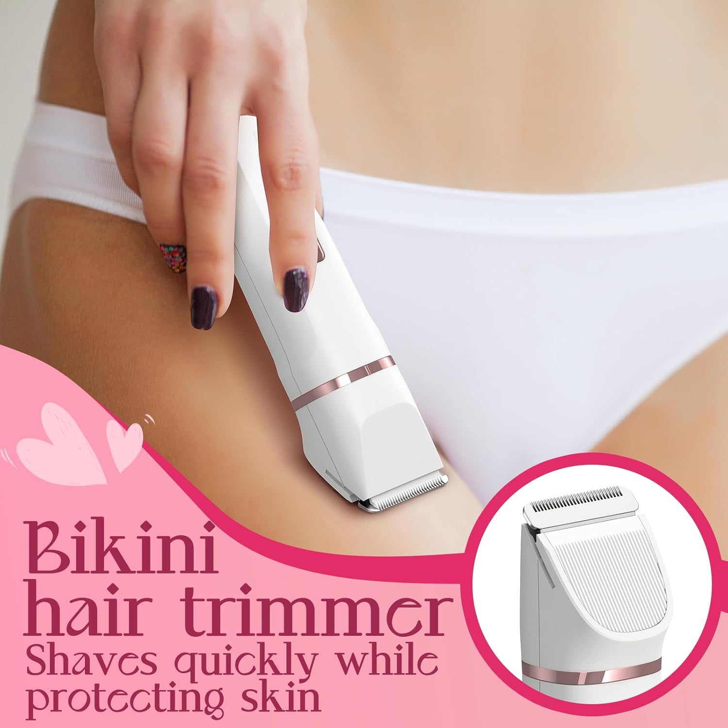 Pubic Hair Trimmer Women - 2-in-1 Electric Bikini Shaver & Facial Hair Remover, Waterproof Body Groomer with Ceramic Blades, USB-C Fast Charging Dock, Cordless Razor for Women's Sensitive Skin (White)