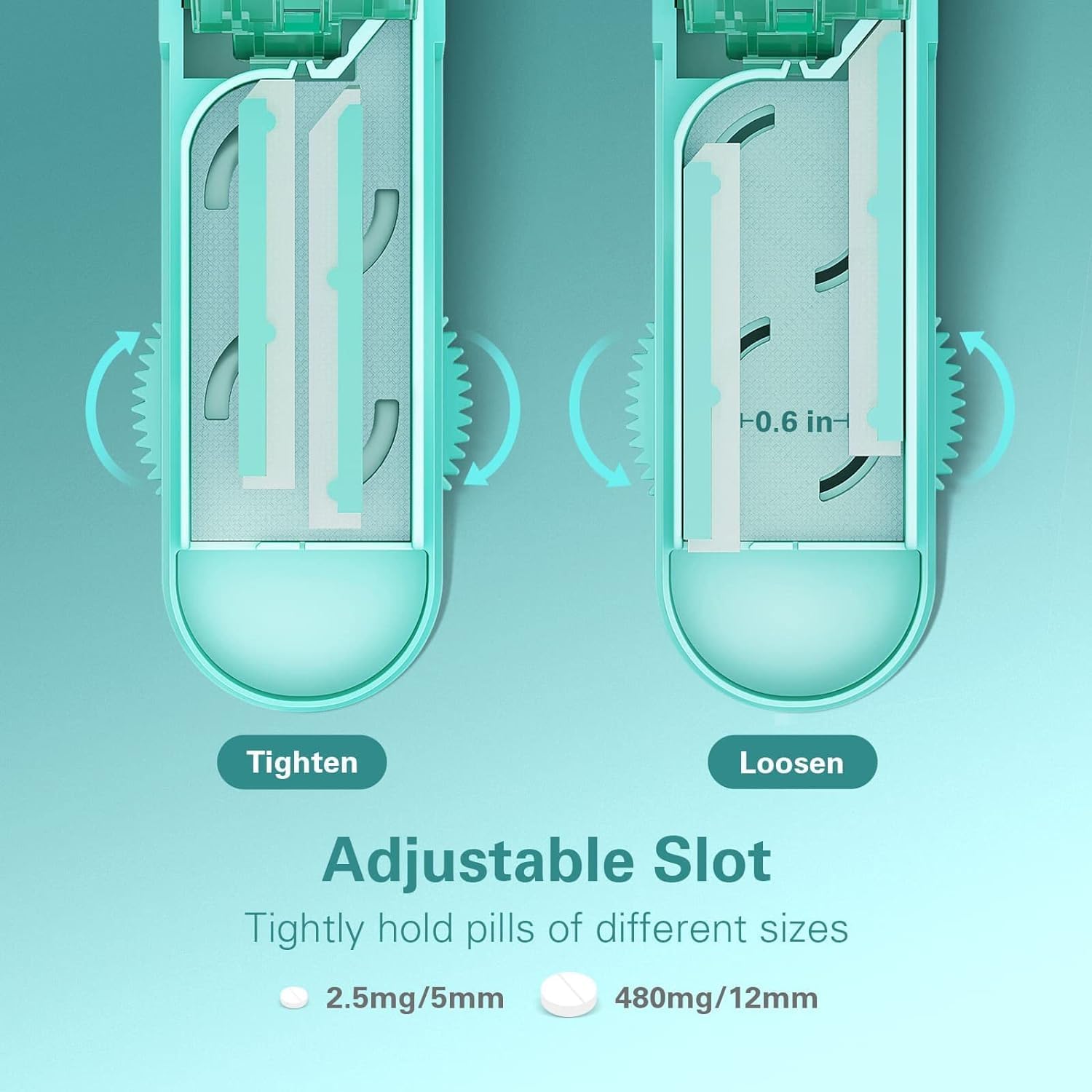 - 【Easy to Use】: Just rotating the adjustable slot of pill cutters for small or large pills professional to ensure the pills to be placed in the center, then press the cover to cut multiple pills into 1/2 or 1/4